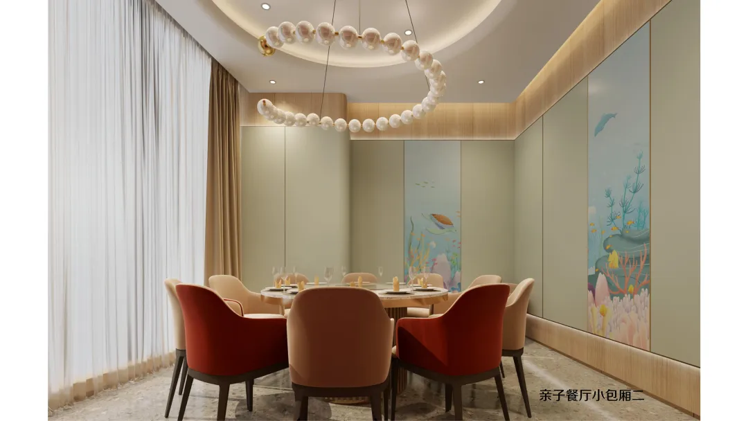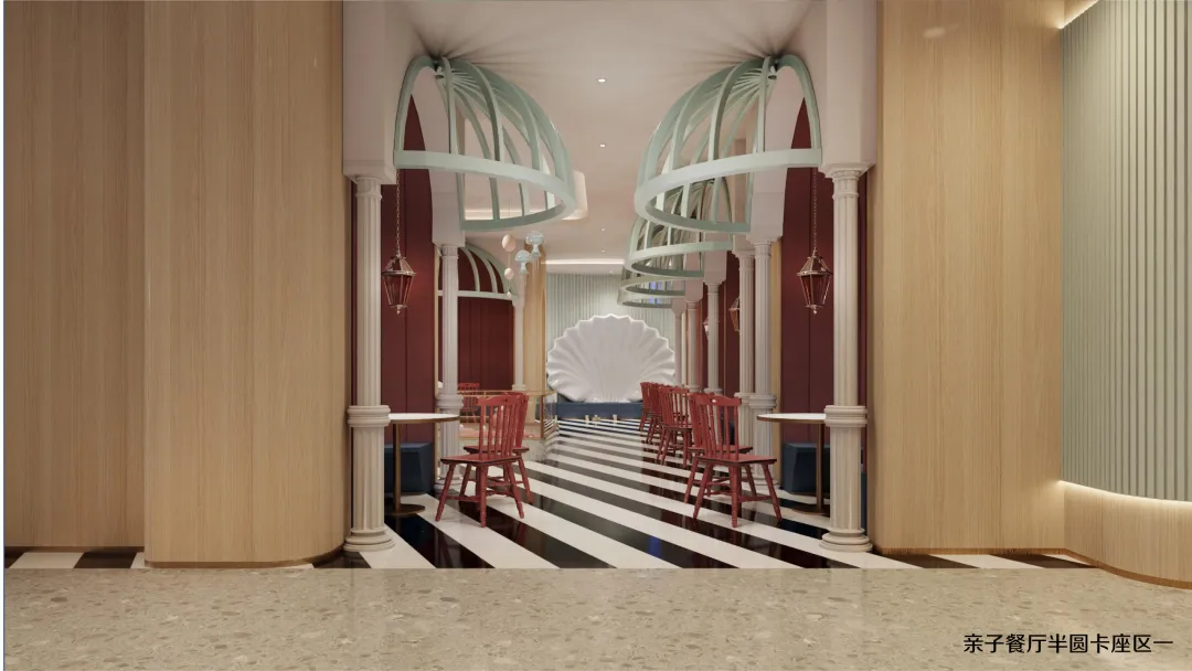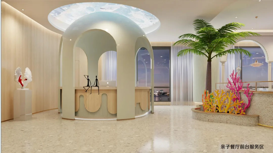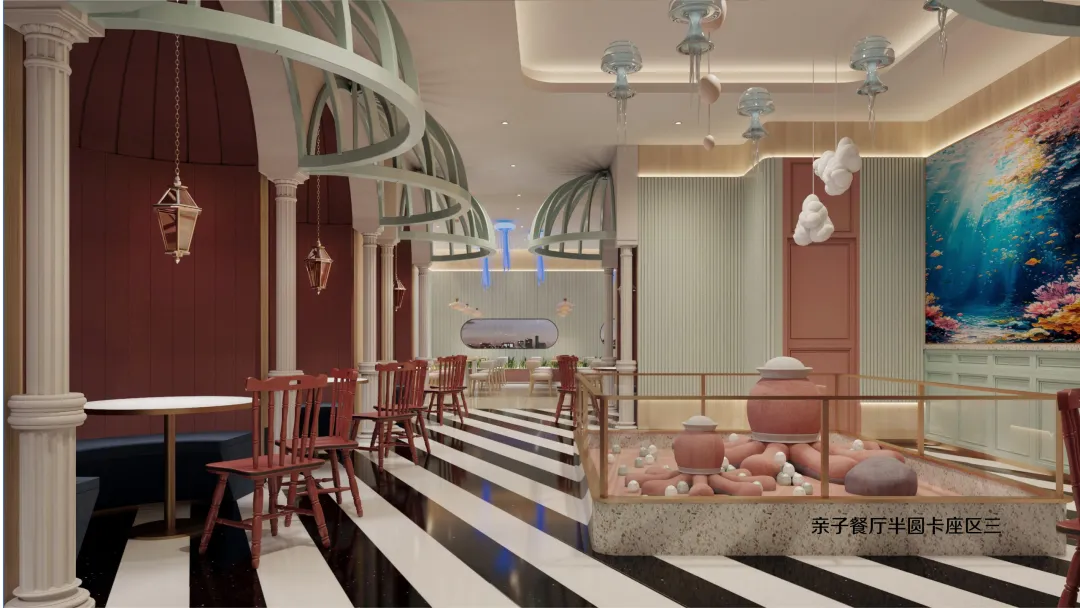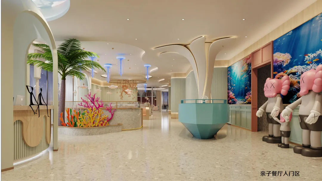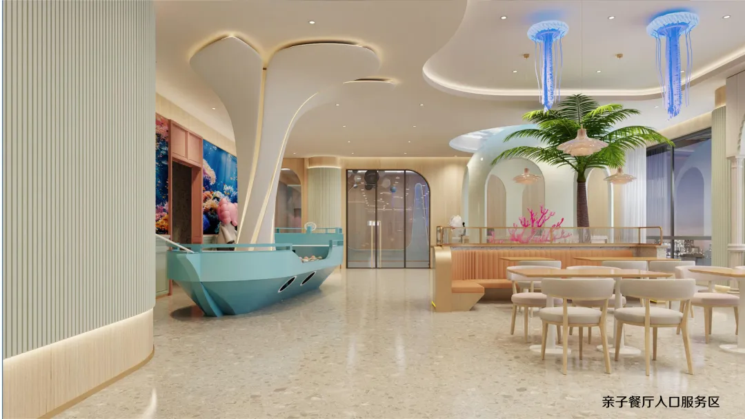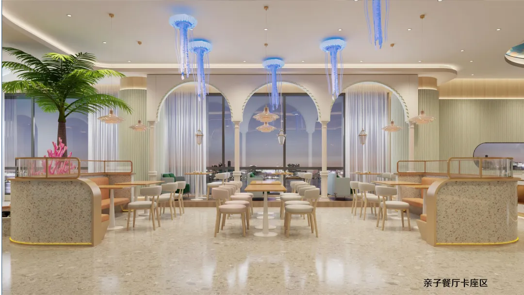 延续海洋世界的设计语言,二层亲子餐厅将贝壳、海马、珊瑚等元素融入每一个细节: