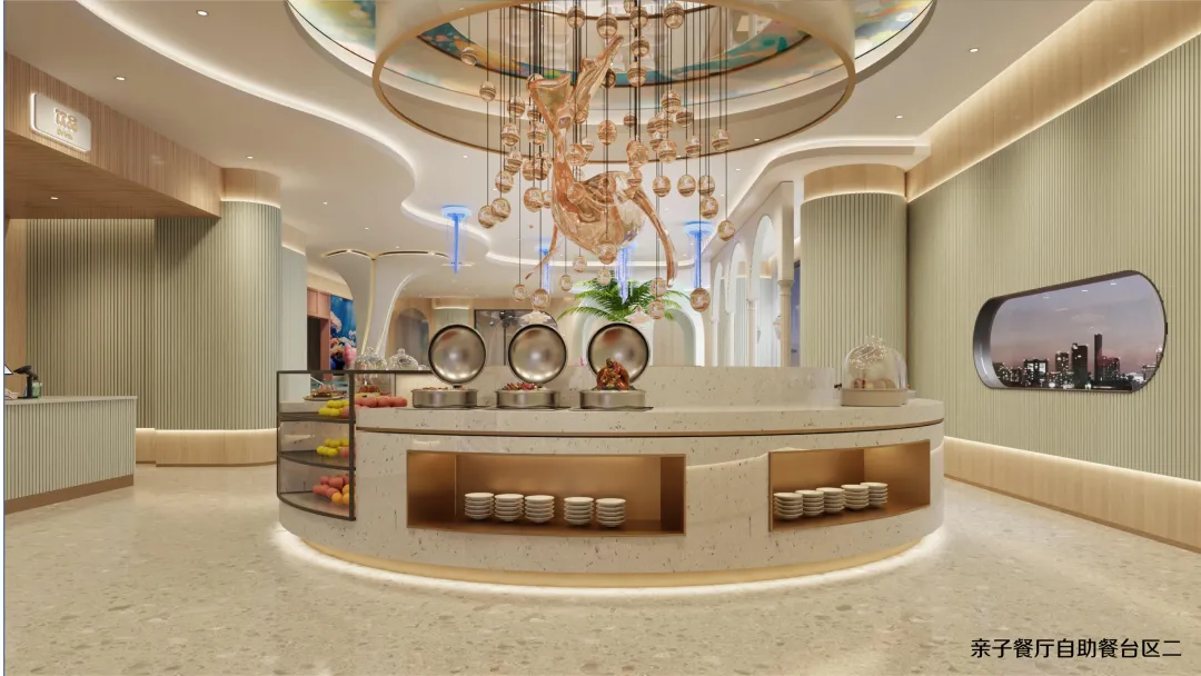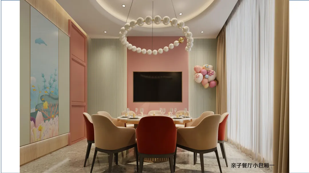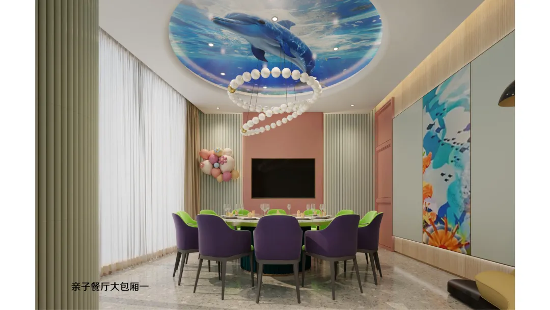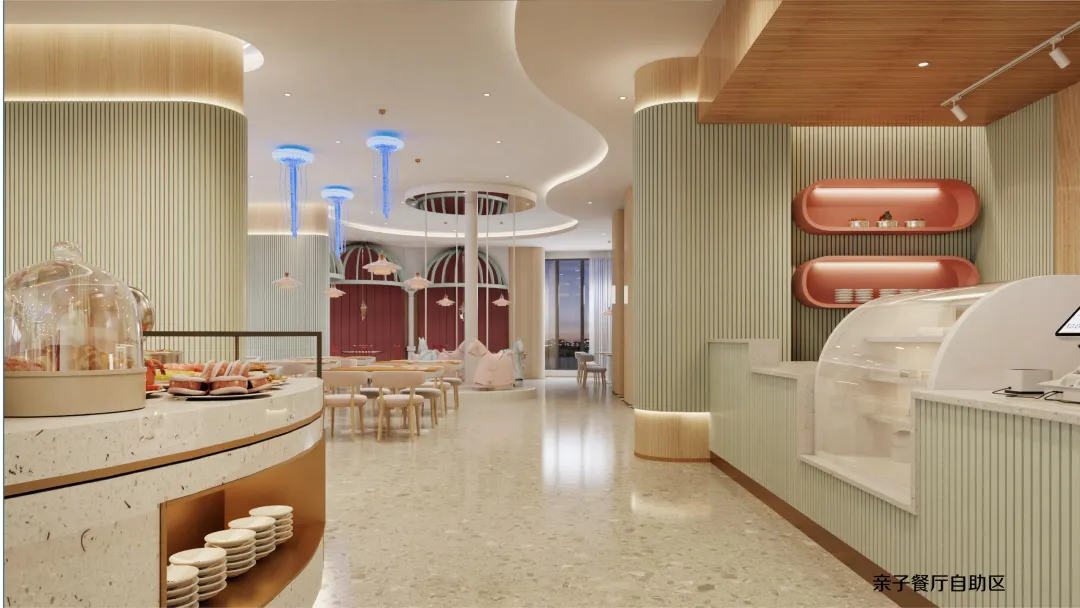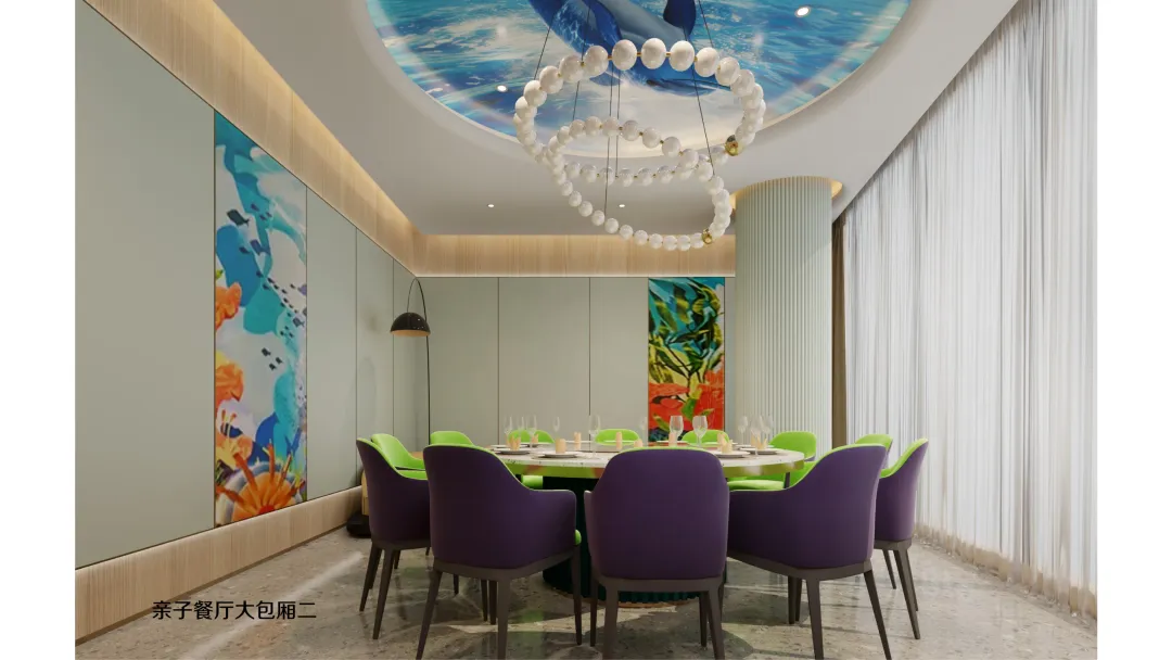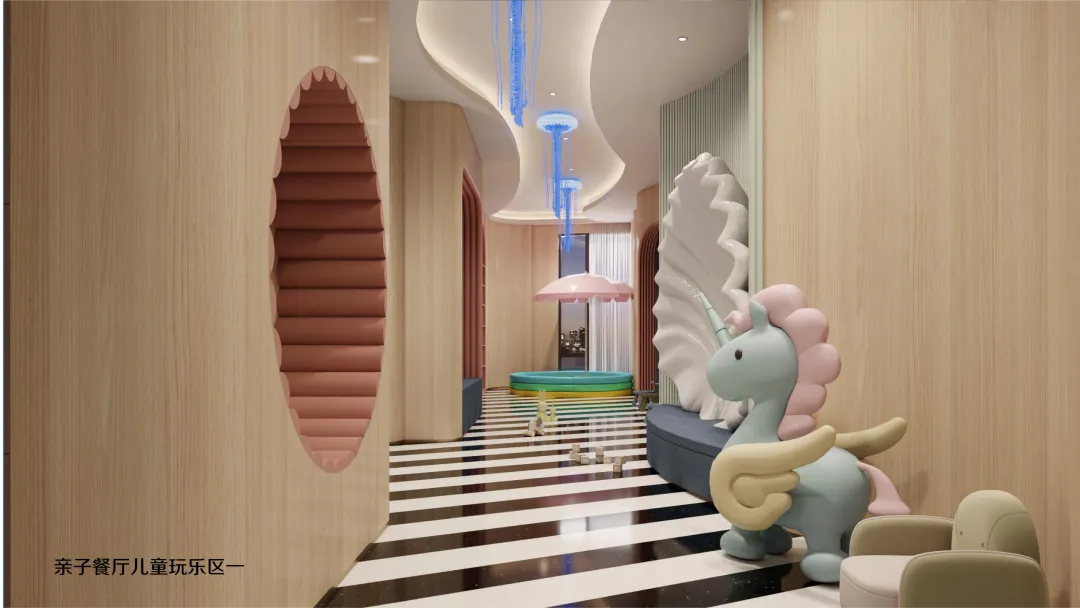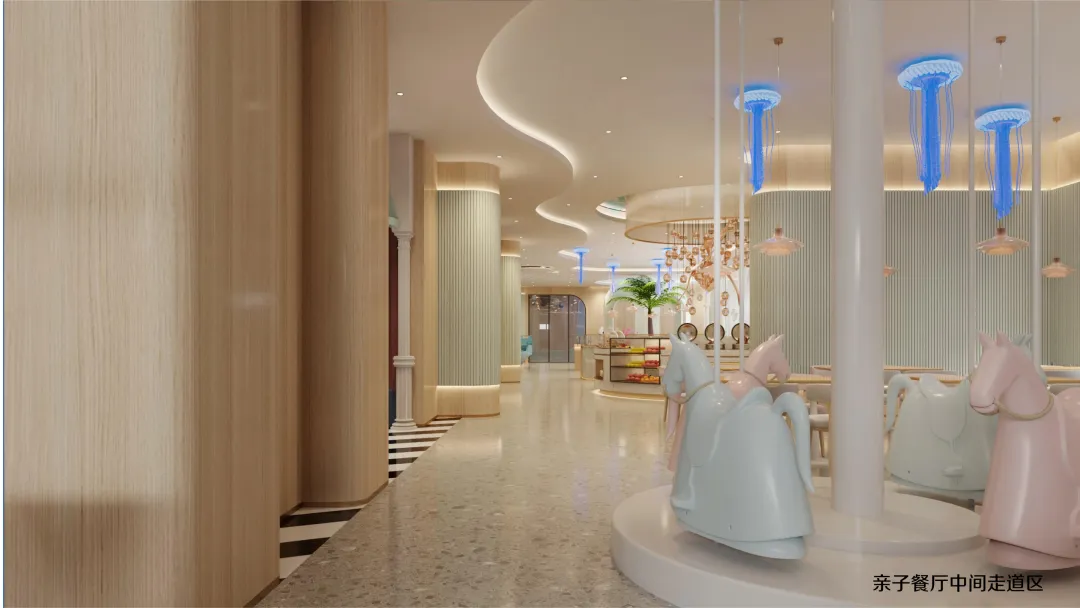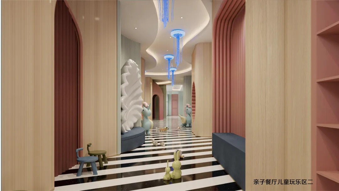 延续海洋世界的设计语言,二层亲子餐厅将贝壳、海马、珊瑚等元素融入每一个细节:
