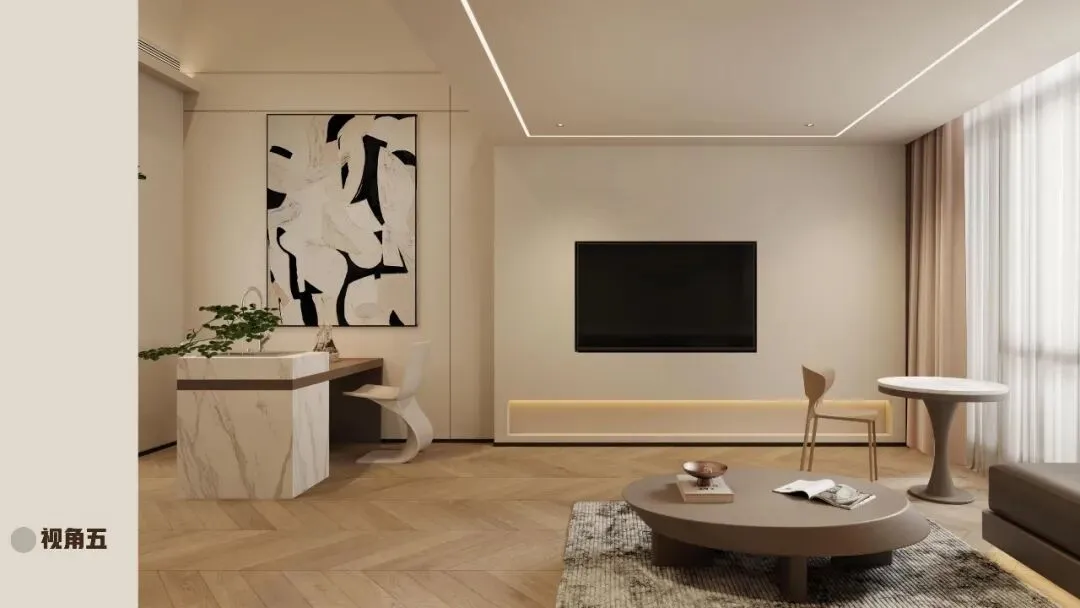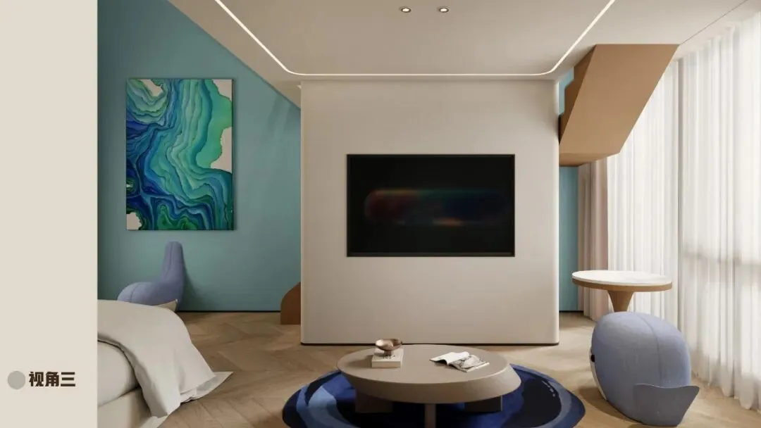 细节:无多余装饰,仅以一幅抽象海浪画或一件玻璃浮球摆件呼应海洋主题。