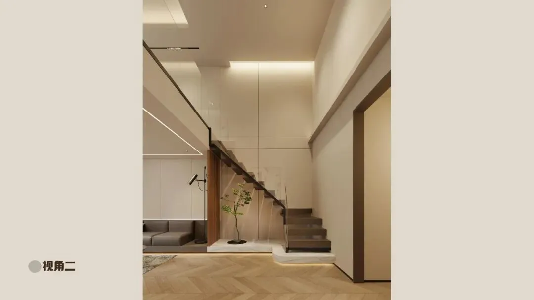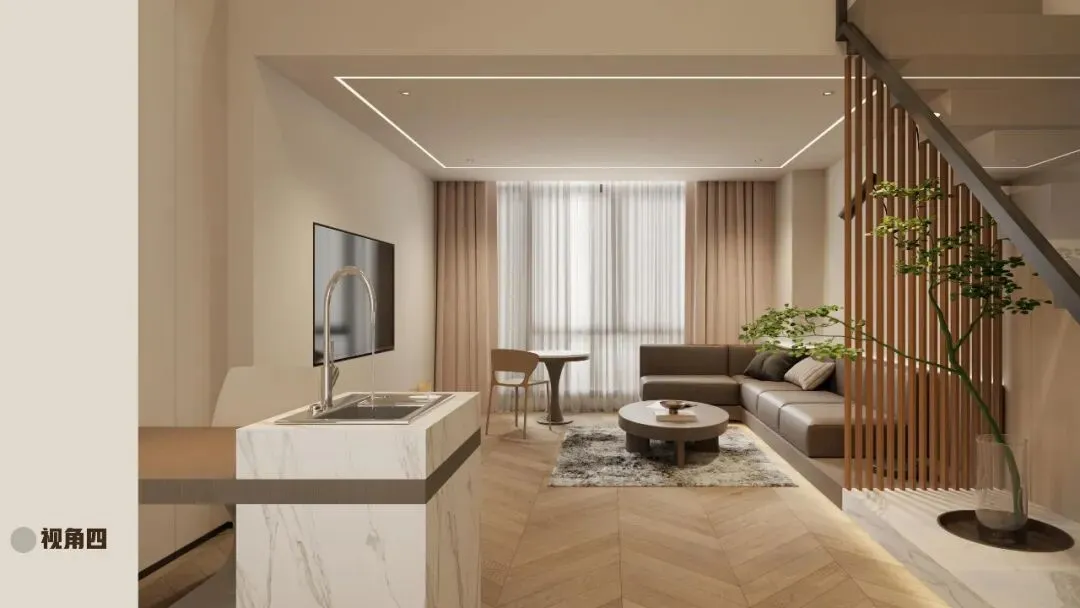 空间:挑高客厅+睡眠夹层,灰、白、木色主调,点缀深海蓝软装。