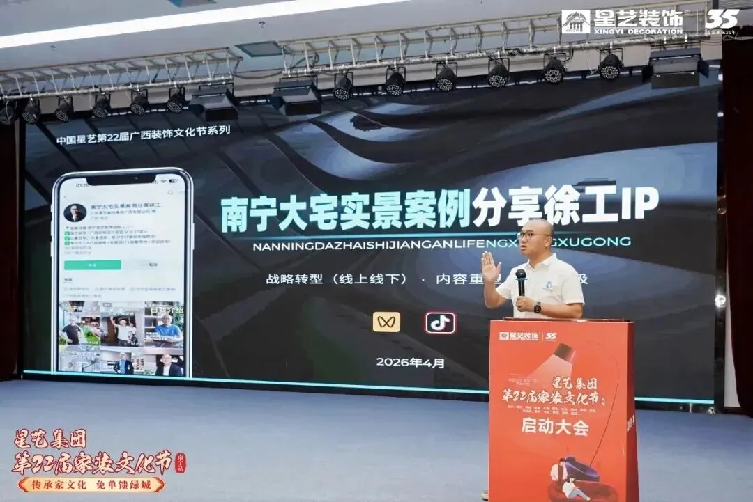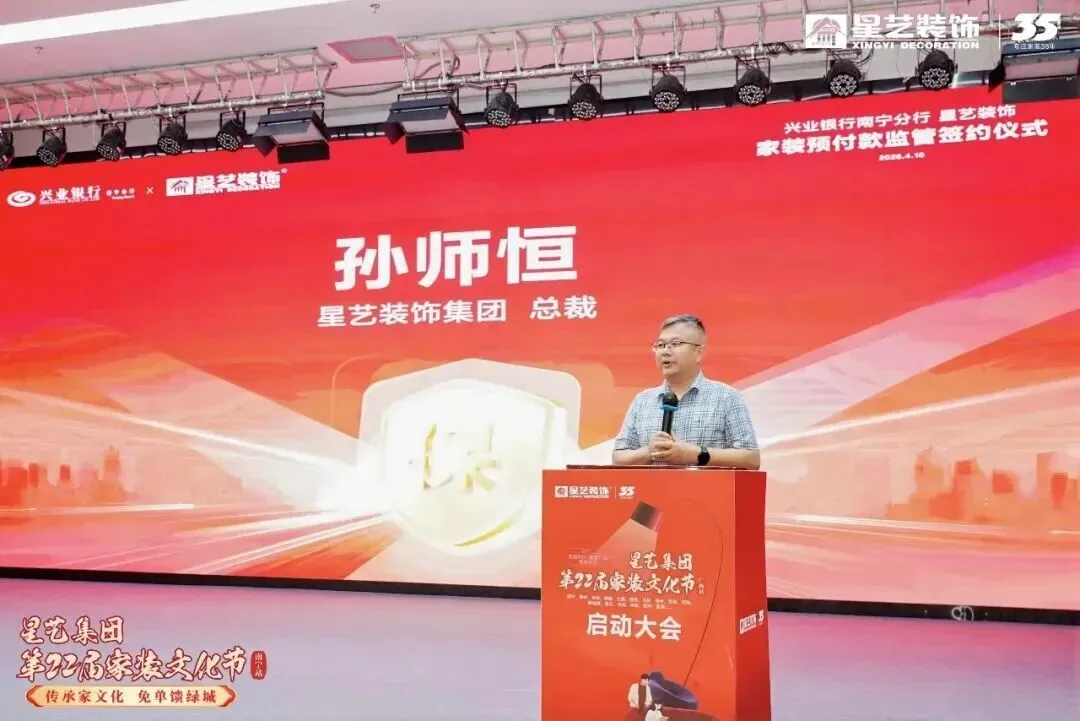 星艺集团总裁孙师恒在启动会上表示,星艺装饰深耕家装行业35载,以匠心筑家,融文化于家装,传承家文化。星艺广西团队持续深耕,将家装文化节打造成品牌核心盛事。本届以“专业+拼搏”为主题,秉持“冠军之选、安心之托”承诺,推出婵宝新家·冠军同源工艺,以冠军标准升级工程与服务,坚守品质与初心,创新赋能,凝聚合力,共筑安心之家。