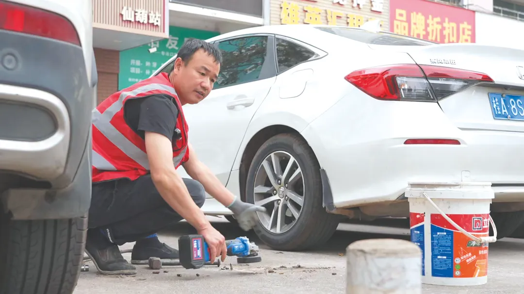 “南宁城市太大,道路太多,光靠一个人看不过来。”王丁文深感个人力量有限,今年初,他尝试用短视频记录“拔钉”点滴并分享至网络平台。画面中没有花哨的特效,只有他蹲在街头专注拔钉、打磨路面凸起异物的背影,配文简单明了:“辅道暗器,举手之劳,处理隐患。”