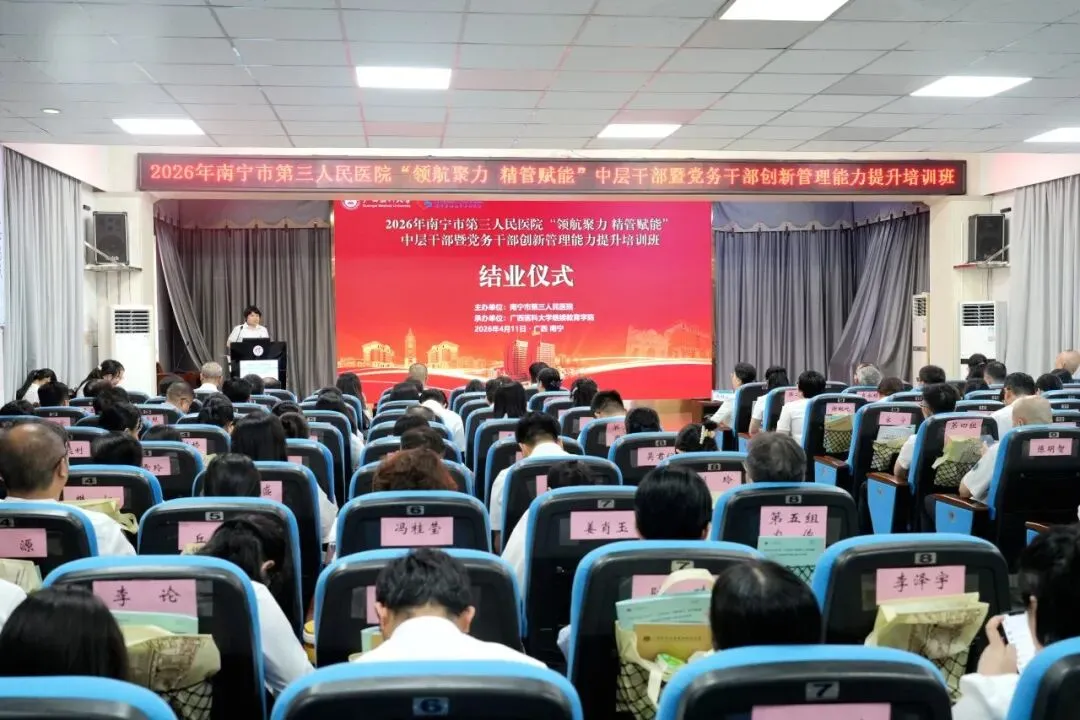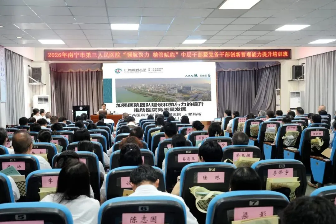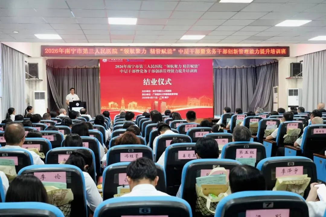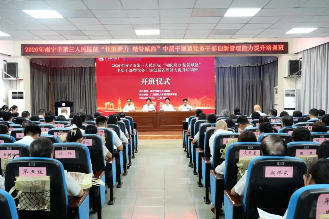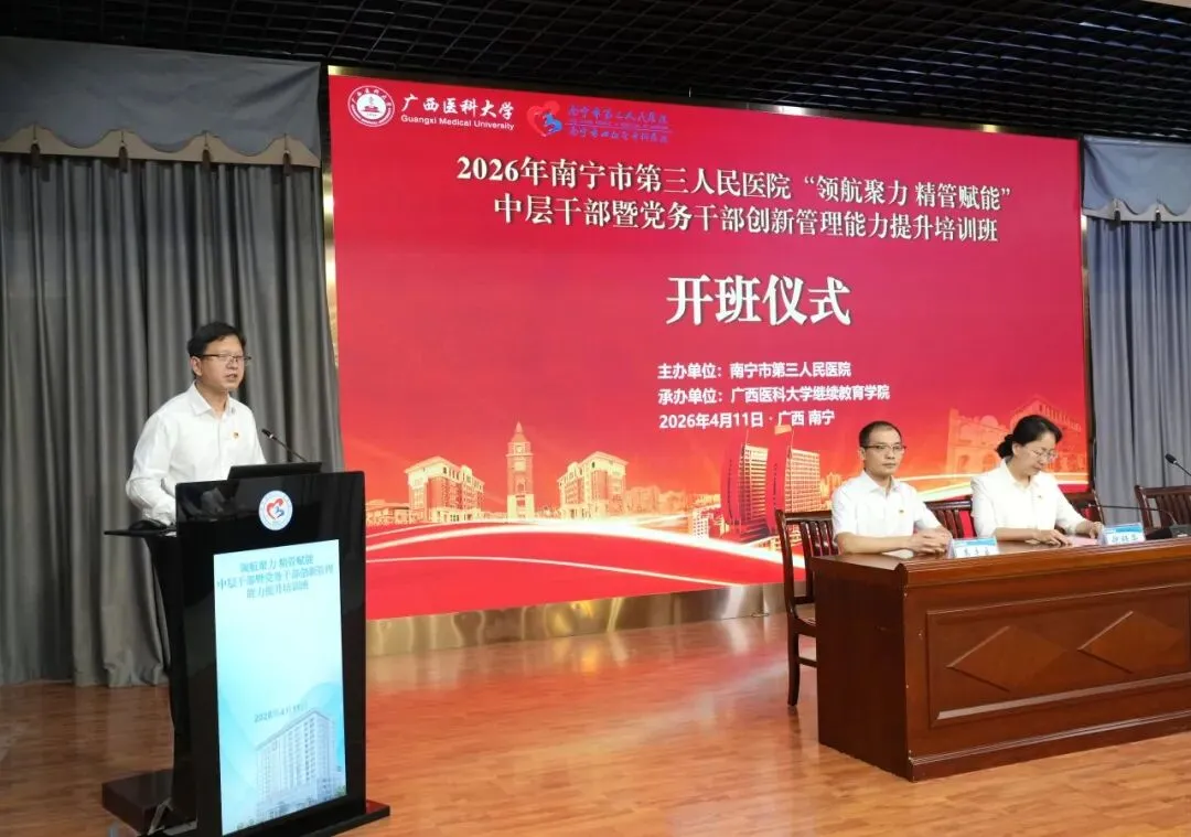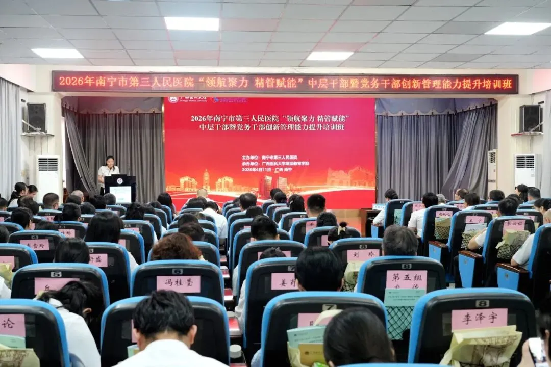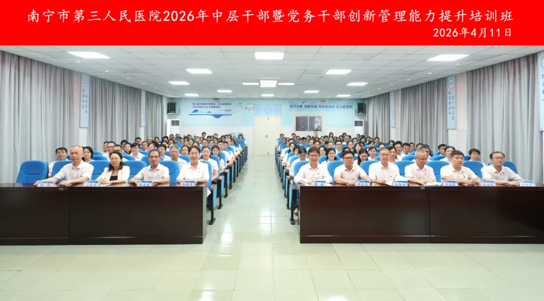为深入贯彻落实党的二十大和二十届四中全会精神,全面提升医院干部队伍能力,为高质量发展提供坚实的人才支撑,4月11日,由南宁市第三人民医院主办,广西医科大学继续教育学院承办的“领航聚力 精管赋能”中层干部暨党务干部创新管理能力提升培训班成功举办。