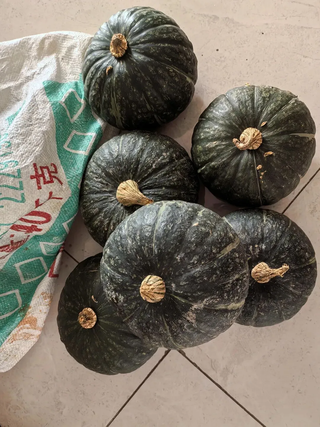 中午孩子爷爷过来了。提了一麻袋东西,六个贝贝南瓜,四条鱼,几根胡萝卜,一袋南瓜苗,一袋番薯叶。