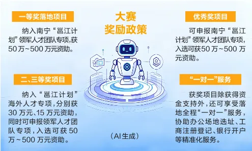 大赛奖励政策直通南宁市“邕江计划”项目等人才支持政策。一等奖落地项目纳入南宁市“邕江计划”领军人才团队专项,给予50万~500万元资助。二、三等奖项目纳入“邕江计划”海外人才专项,分别给予项目资助30万元、15万元。同时,二、三等奖和优秀奖项目均可申报南宁市“邕江计划”领军人才团队专项,入选者可获50万~500万元资助。入驻南A东盟谷还可对应享受专项政策支持。获奖项目除获得资金支持外,还可享受落地全程“一对一”服务,协助办公场地选址、工商注册登记、银行开户、税务登记、纳税申报指导等精准化服务。此外,大赛还为参赛项目提供免费食宿,为推荐机构、落地引荐单位设置专项奖励。