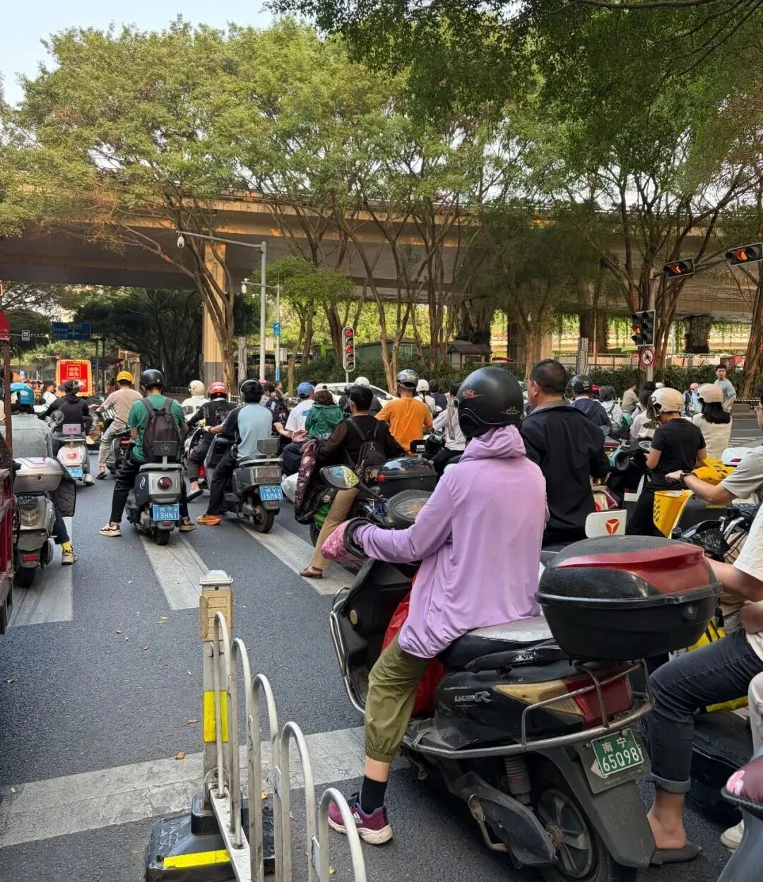 晚高峰的南宁大桥、民族大道,水泄不通。南宁的街头有很多电动车,下班的时候,路口黑压压一片,像迁徙的鱼群。