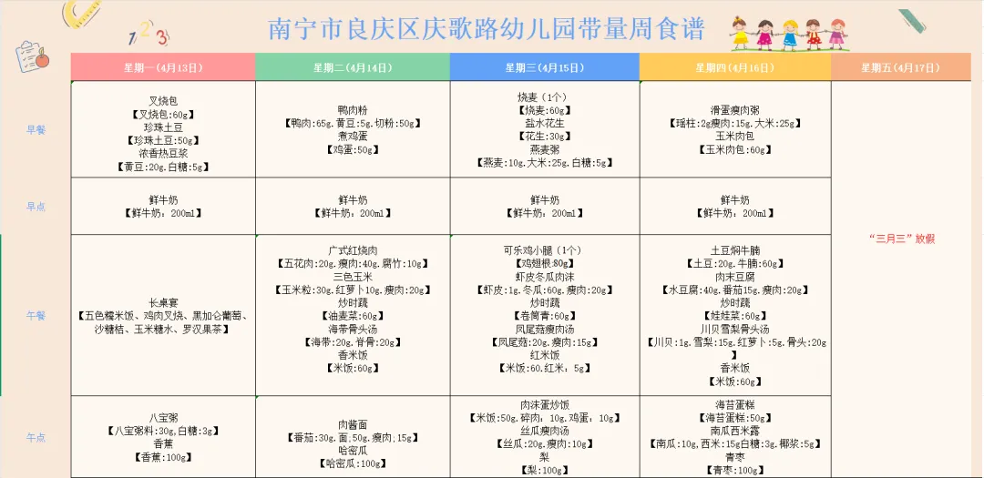 【一周食谱】不负美好“食”光——南宁市良庆区庆歌路幼儿园一周营养食谱(第七周4.13-4.17)