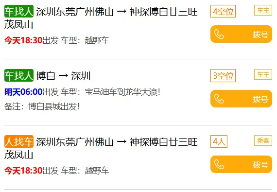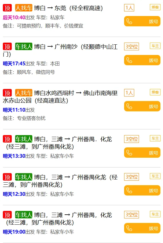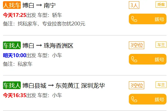 你不用去挤火车、客车,降低接触风险,而且只要你和车主(乘客)商量好,就能实现“家门口上车”,从此告别拥挤和不卫生;日常出行,临时出行很着急,有了博白腾飞拼车网,你再也不用买票、取票、乘车来回麻烦,看到拼车信息,即可高枕无忧出行啦;不管是开车,还是乘车,全部是咱们同城人,你可以尽情结交朋友。