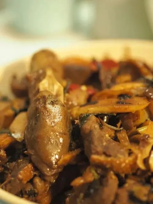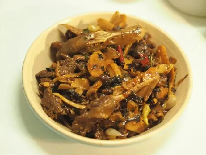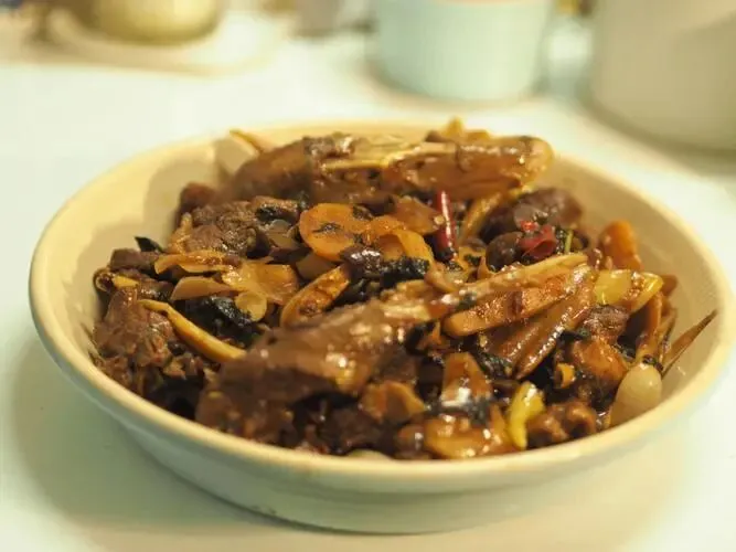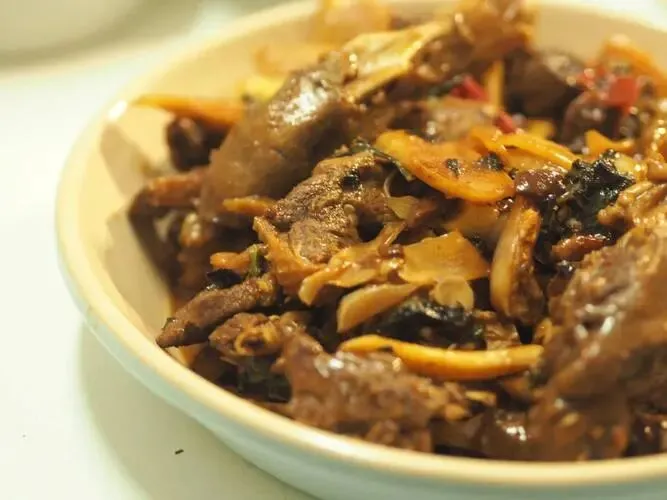 接着放入鸭块翻炒,淋入生抽、黄酒、腐乳、黄皮酱等调汁,翻炒均匀后加少量清水,文火慢焖20分钟,让酸香与酱香层层渗入鸭肉肌理。最后收汁时,放入去核酸柠檬丝与紫苏,快速翻炒片刻,待酱汁浓稠裹满每一块鸭肉,即可出锅。