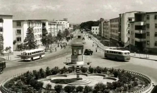 这张路口照片我很喜欢。中间是岗亭,周边是环形花坛,公交车从两边绕过去,建筑也都规规矩矩地立着。你会发现,当年的城市秩序感,很多时候就体现在这种细节里:路口有人指挥,车辆各走各的,自行车也不抢。它不靠复杂设计撑场面,却让人看得很踏实。这样的场景,你以前见过吗?