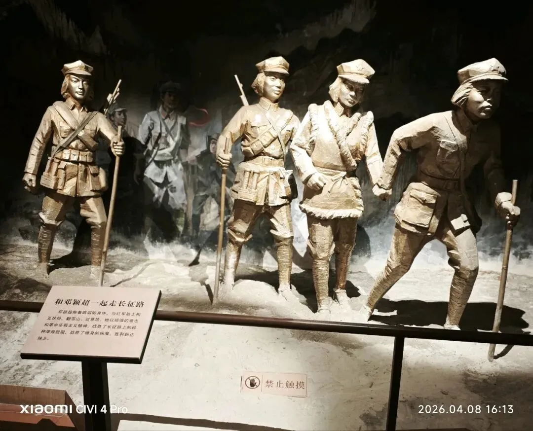 第二展区复刻长征征程,再现邓颖超拖着病体,与红军战士相携翻雪山、过草地的模样。她凭顽强意志与乐观初心,熬过漫漫征途、扛住缠身病痛,终随队伍抵达陕北。