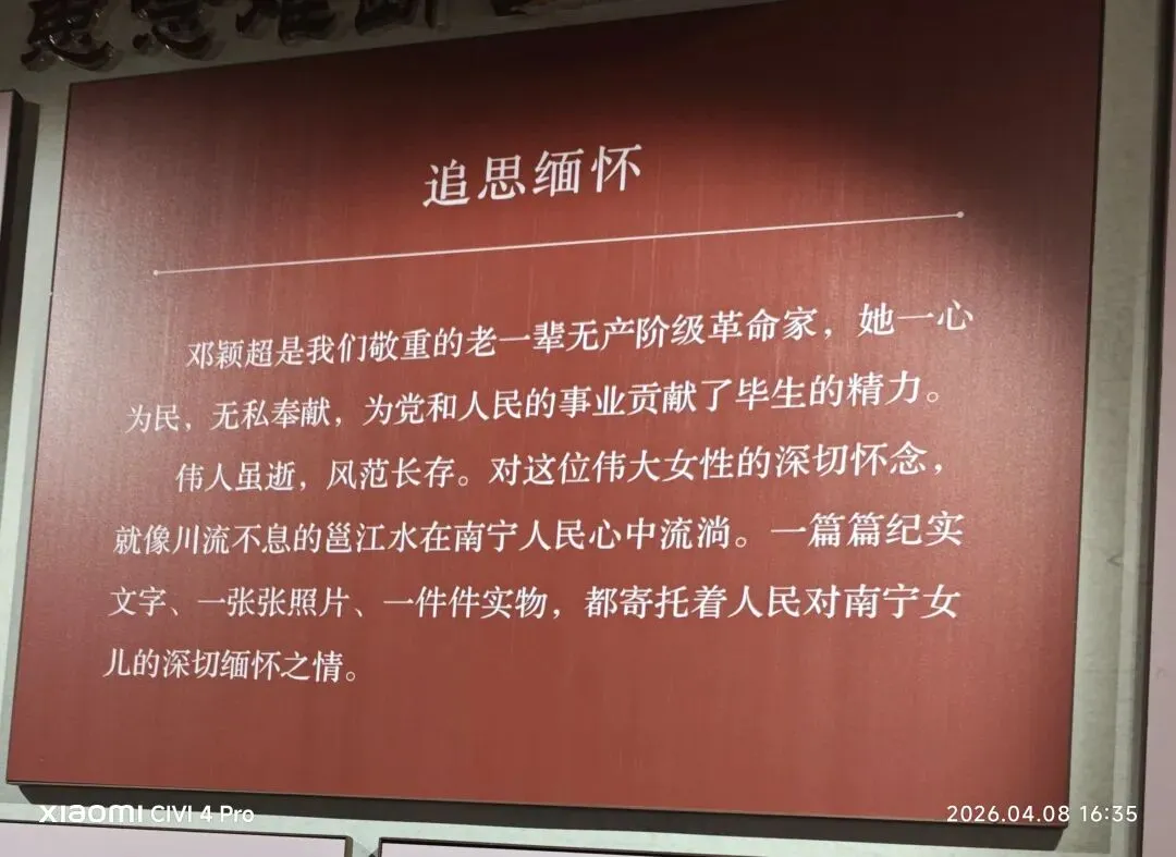 午后三点钟,一辆旅游大巴停靠纪念馆前,操着各地口音的游客三五成群,慢步步入庭院。大厅中央,邓颖超的铜像静静伫立,一身深色大衣,神态温和从容,眉眼含笑望向远方,心底似乎始终牵挂着故土山河。铜像左侧墙面,“南宁女儿”四字金题熠熠生辉,道尽她与邕城割舍不断的血脉联结。