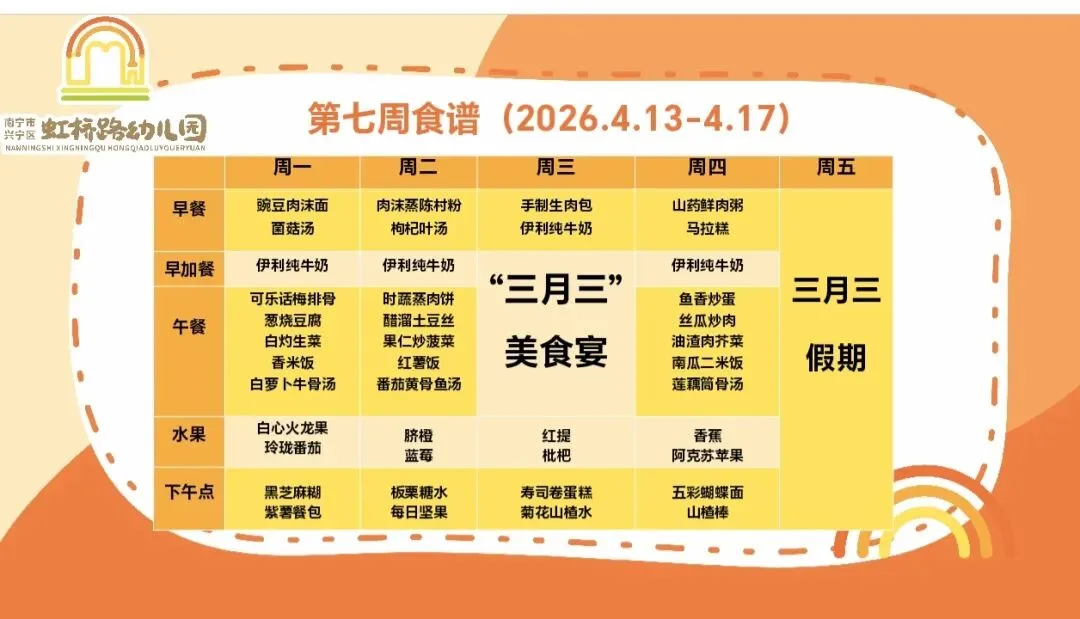 >【美好“食”光】南宁市兴宁区虹桥路幼儿园第七周营养食谱(2026.4.13——4.17)