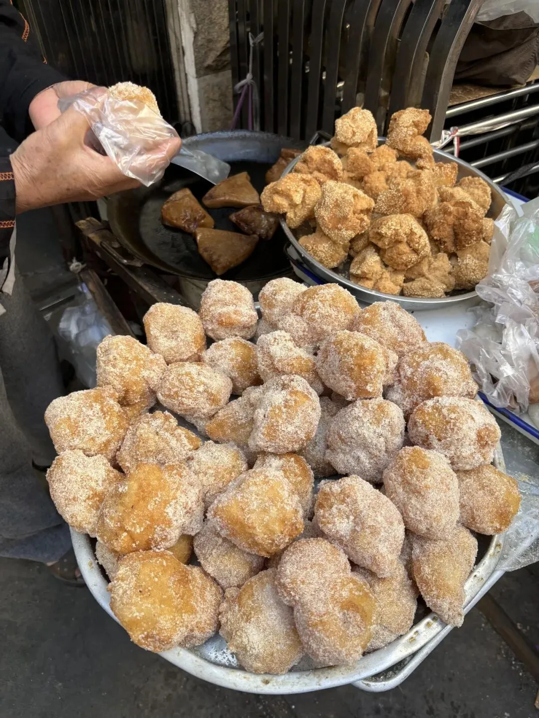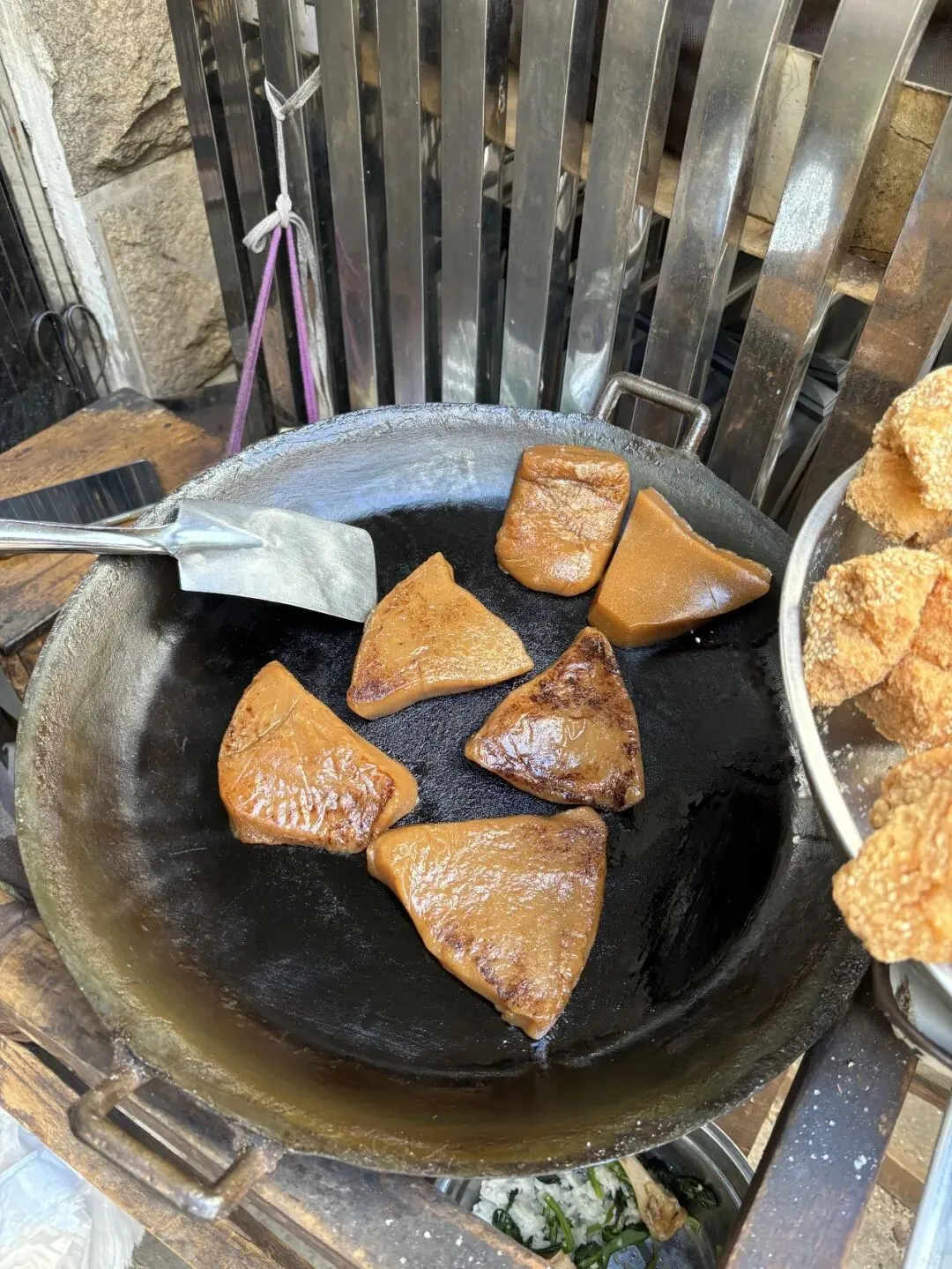 拐个弯就看见阿婆的小摊子,黑铁锅支在煤炉上滋滋响,几块棕乎乎的三角糕在锅里煎得油亮,边上还堆了两大盘糯叽叽,一盘裹满了白砂糖粉,一盘沾着白芝麻,围了三四个本地人在那等,我也凑上去凑热闹。