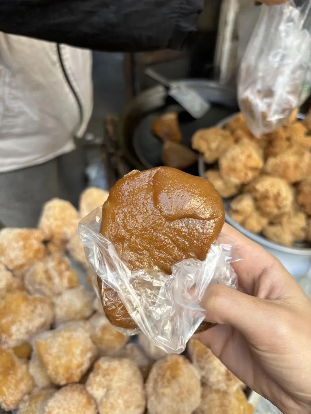 我的妈呀,外面那层煎得焦焦的,脆生生的带点油香,里面是真糯啊,软乎乎的还带点韧劲儿,咬开能感觉到那种糯叽叽的拉扯感,红糖味不齁甜,就是温温的甜香,混着点煎过的焦气,我站在路边两分钟就吃完了,擦嘴的时候又回去买了两块,连旁边裹砂糖的我都顺带买了俩,不过说实话还是煎的这个最对我胃口。