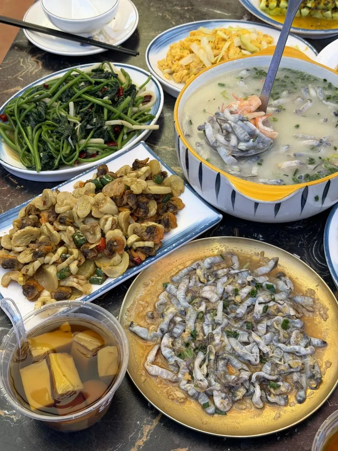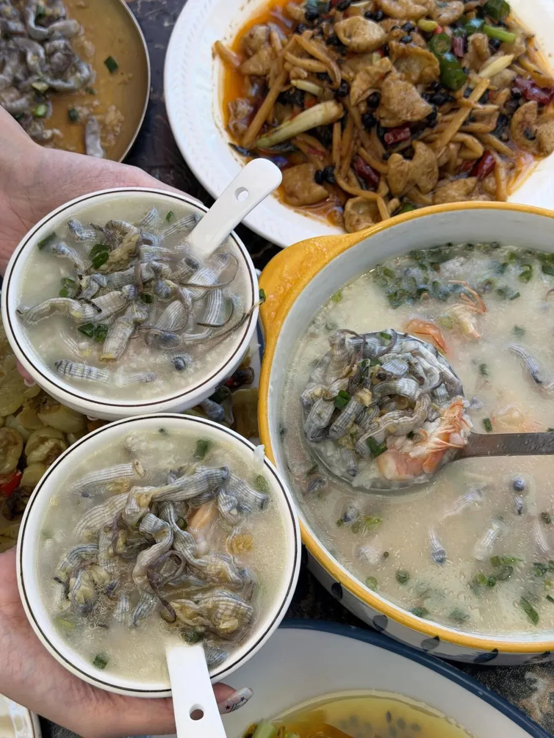 那盆飘满小虫子的粥我第一眼真的不敢碰,疙疙瘩瘩的一条条看着有点吓人啊,朋友说这是沙虫,鲜得很,另一个跟着来的朋友当场就怼他,说什么沙虫这明明是泥丁,俩人为了个名字差点在饭馆吵起来。