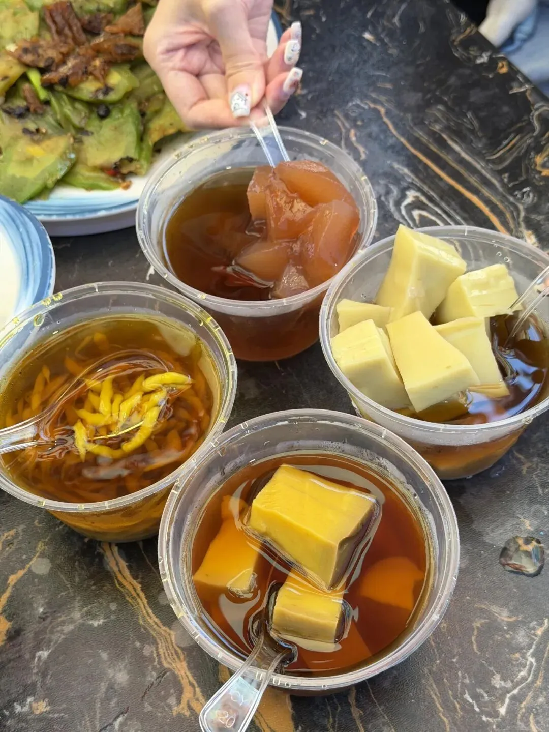 还有那几碗凉丝丝的糖水,我一开始以为是凉豆腐呢,滑溜溜的,甜水是那种很清爽的蔗糖味,一点都不齁,黄色的朋友说用槐花做的,咬开还有淡淡的花香味,还有那个细细的黄条条的,还有半透明一块块的,我吃半天都没记住名字,解腻真的一绝,刚吃完重油的菜嗦两口,整个人都舒服到叹气。