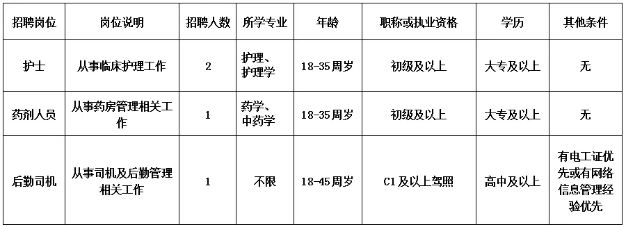 二、报名基本条件(一)遵守中华人民共和国宪法和法律;(二)具有良好的政治素质和道德品行,热爱医疗卫生事业,无违法违纪等不良记录;(三)具备岗位所需的专业知识和专业技能,能履行岗位职责;(四)具有良好的语言表达和沟通能力,身体健康。三、招聘方式:本次招聘采取笔试(部分岗位)、操作考核(部分岗位)及面试的方式,择优录取。具体时间安排另行通知。四、报名时间:公告发布之日起至招聘人员满为止。五、报名方式及要求:网络或现场报名。有意向者请将个人简历、身份证、毕业证、学位证、执业证、资格证等扫描成压缩包,以“应聘岗位+姓名”方式命名发送至医院邮箱:ljrs1169@163.com或到医院进行现场报名,地址:南宁市武鸣区两江镇中心卫生院医院办公室。六、联系方式:联系人:小黄 电话:0771-6091871七、投诉监督电话:南宁市武鸣区卫生健康局人事股:0771-6238560。南宁市武鸣区两江镇中心卫生院2026年4月9日