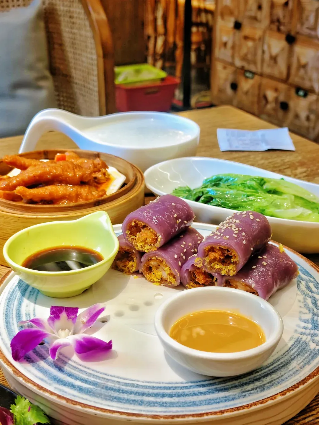 他们家的早茶跟广东那边一模一样,好吃的实在太多了。天鹅模样的酥皮点心,做得特别逼真,咬一口直掉渣,里面又香又甜。还有那个紫色的鲜虾红米肠,软糯的外皮包着脆脆的内馅,蘸着酱料吃,真的是香迷糊了,连小孩子看了都馋得直流口水。