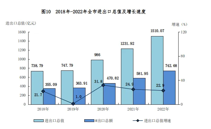 全年外贸进出口总值1510.07亿元,比上年增长22.9%。其中,进口总值767.40亿元,比上年增长18.6%;出口总值742.68亿元,比上年增长27.6%。