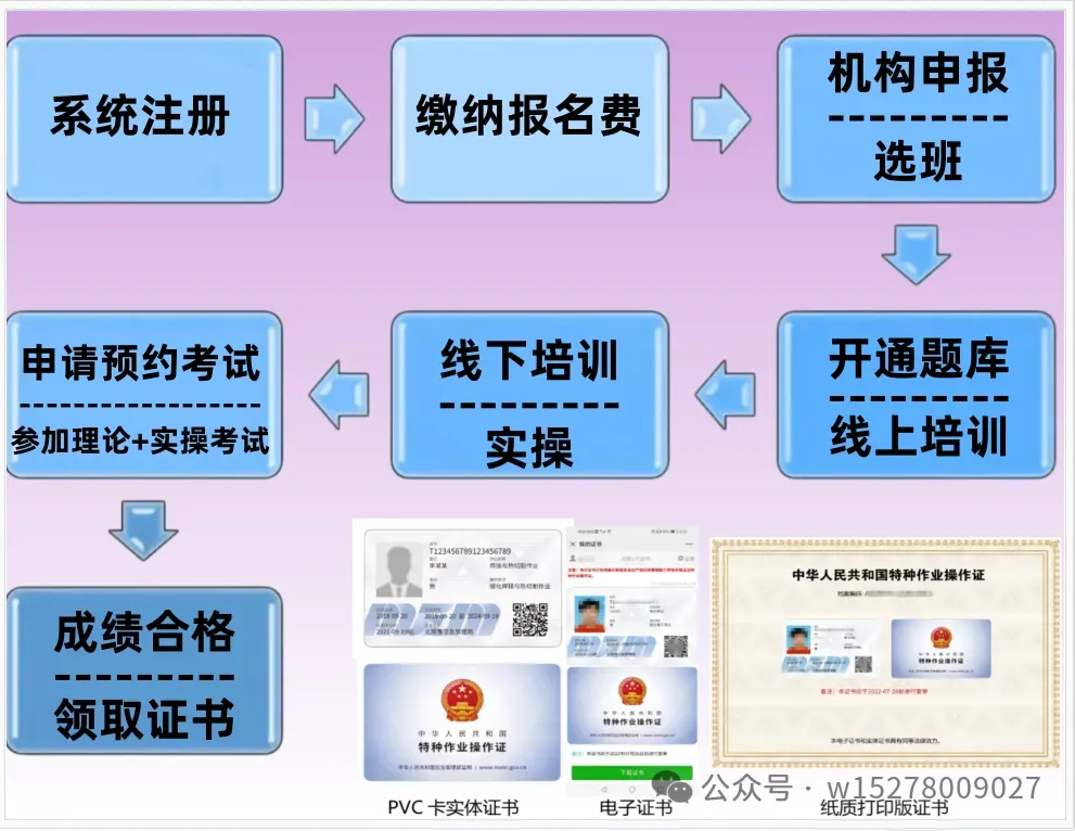选择正规定点机构提交资料报名(现场或线上)一参加培训(线上+线下)一预约考试(考生通过小程序预约考试)一参加考试,合格后颁发证书