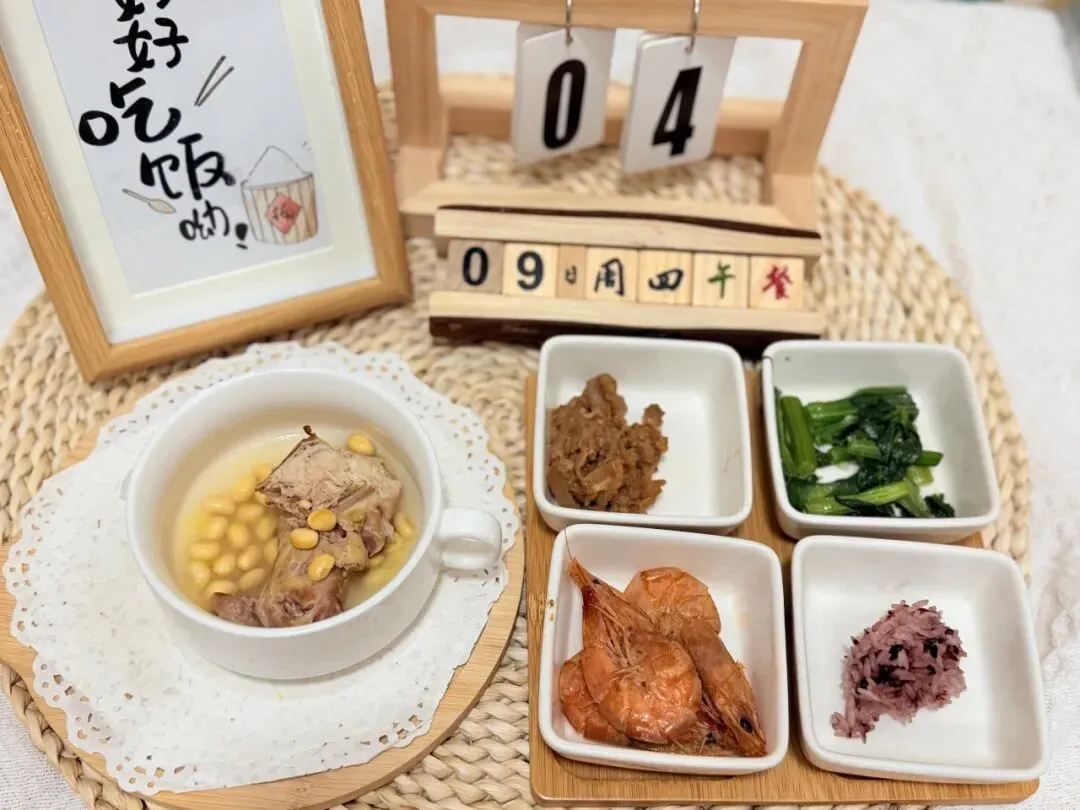 蒜香菠菜、鲜美鲫鱼汤、红豆香米饭