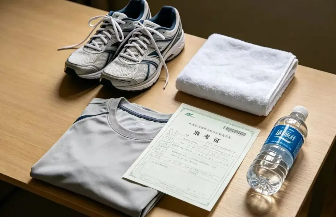 • 必备物品:身份证、准考证(反复确认放双肩包)、备用外套(考场保暖,考完及时穿)、镁粉(引体防滑专用)、水杯等。