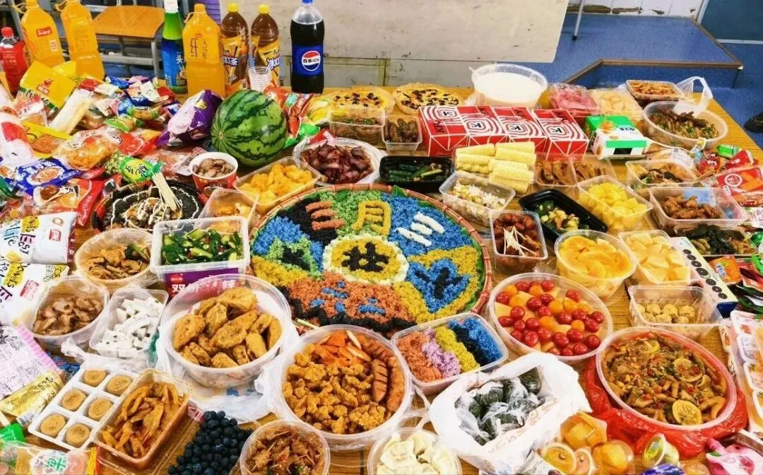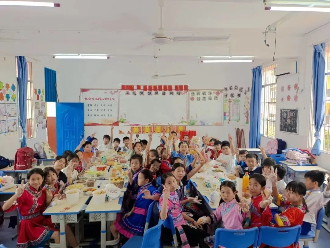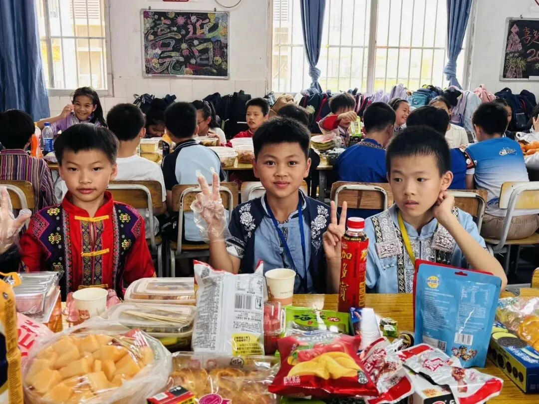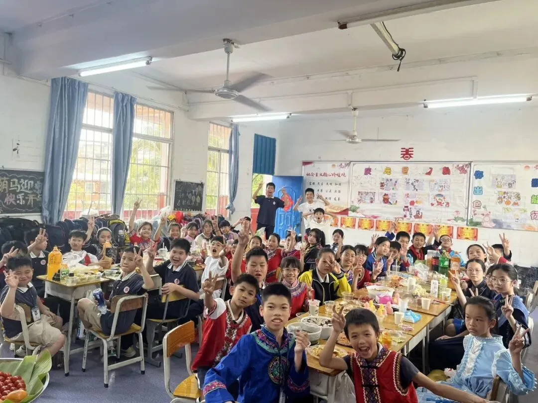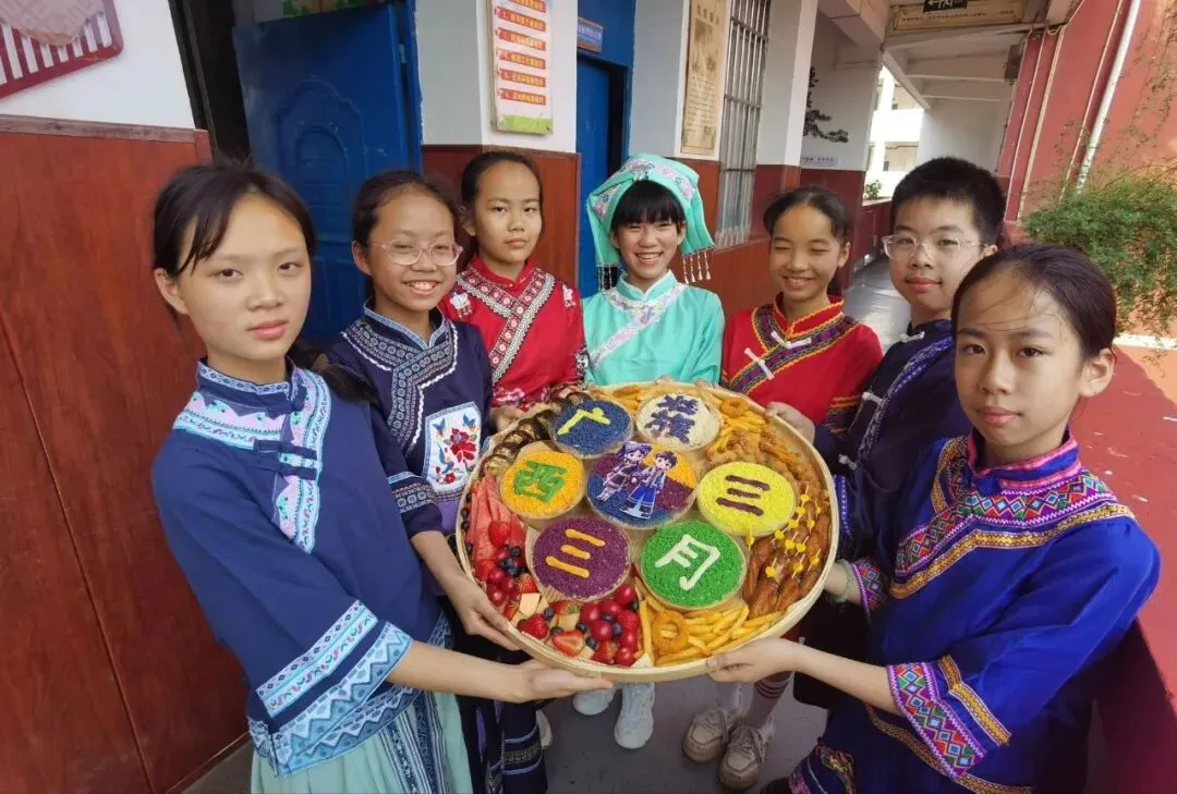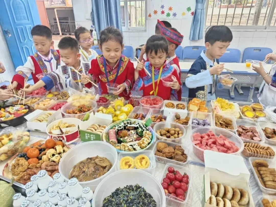 美食分享环节精彩纷呈,各班创意十足、各显神通。有的班级用红蓝草、黄姜、紫薯等天然植物染料,精心蒸制出色香味俱全的五色糯米饭,色彩艳丽,寓意吉祥;有的班级带来了地道的壮乡小吃“艾叶糍粑”“蕉叶粑”,软糯香甜,令人回味;还有的班级别出心裁地推出了“壮乡风味拼盘”,将水果、糕点与本地特色食材巧妙搭配。 各班教室化身为“壮乡美食街”,大家一边品尝着五色糯米饭的清香、艾粑粑的甘甜,一边交流着各自家乡的饮食习俗。此起彼盼的吆喝声、欢笑声交织在一起,整个校园弥漫着美食的香气与节日的温情。 未来,我校将持续开展丰富多彩的民族文化主题活动,不断铸牢中华民族共同体意识,让民族团结之花在校园里常开长盛。
