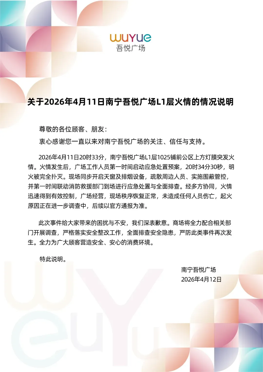 12日晚,南宁吾悦广场发布关于2026年4月11日吾悦广场L1层火情的情况说明,具体如下: