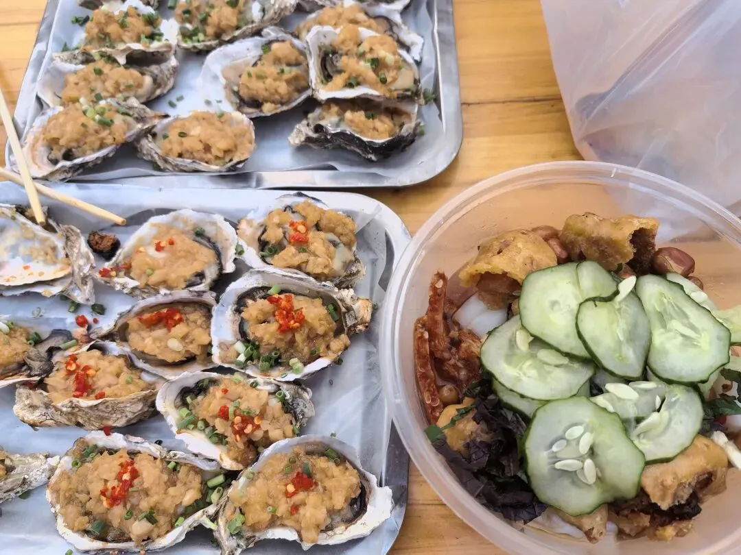 夜市人气虽然很旺,但是味道还是相差有点远,我们吃了两份烤生蚝,一份宾阳酸粉,一份糯米糍,还有双皮奶。