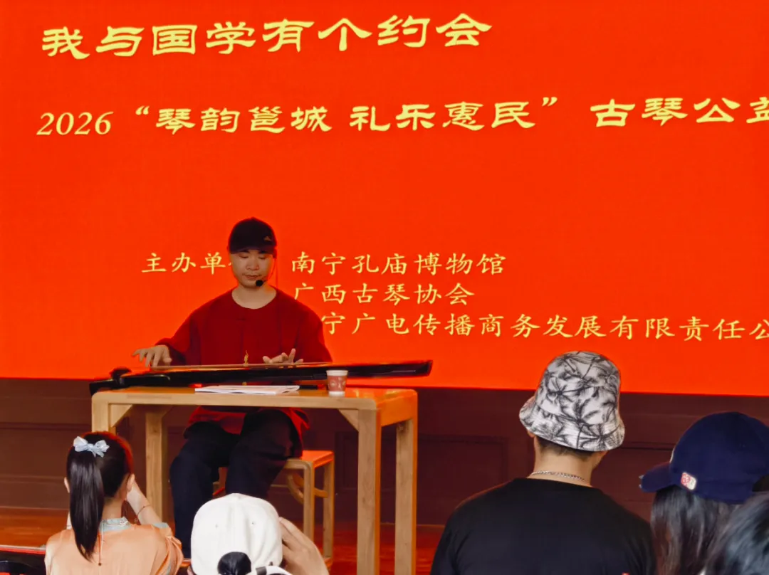 阳春三月,风清景明。为深入落实“十五五”政府工作报告中关于传承中华优秀传统文化、推进公共文化惠民服务的工作部署,积极响应“古琴进景区、进社区”的号召,由南宁孔庙博物馆、广西古琴协会、南宁广电传播商务发展有限责任公司联合举办的2026首期“琴韵满城·礼乐惠民”古琴公益课堂,于3月28日在南宁孔庙博物馆、3月29日在南宁骑楼文化陈列馆顺利开班。