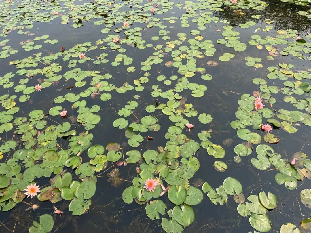 不远处的九曲桥旁,早已荷叶田田,翠绿的荷叶铺满湖面,长势喜人,想来等到五月末,便会迎来满湖荷花绽放的盛景。
