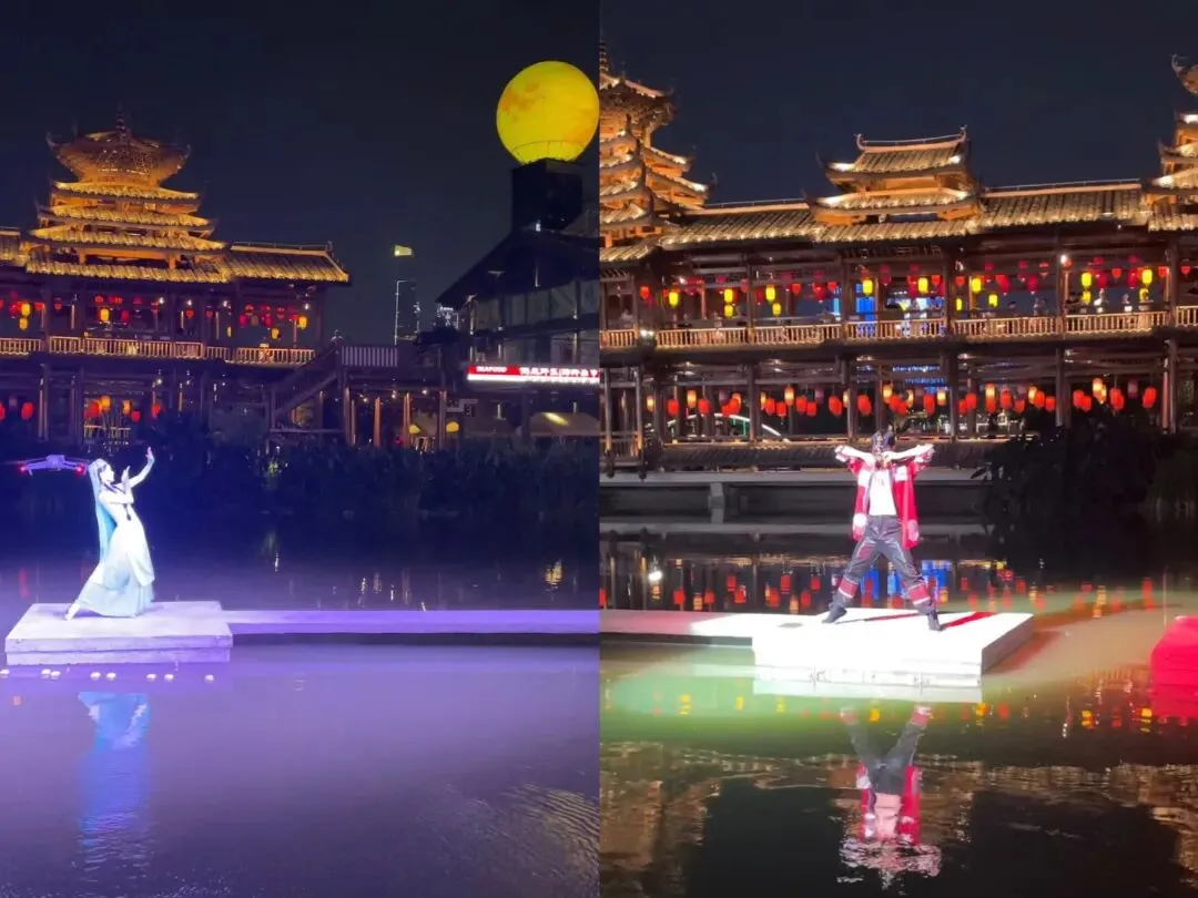 不得不说,来得早不如赶得巧,运气很好顺利坐到了C位,近距离感受表演的魅力,看演员们在水上舞台舒展身姿,灯光映在湖面上,波光粼粼,氛围感拉满。