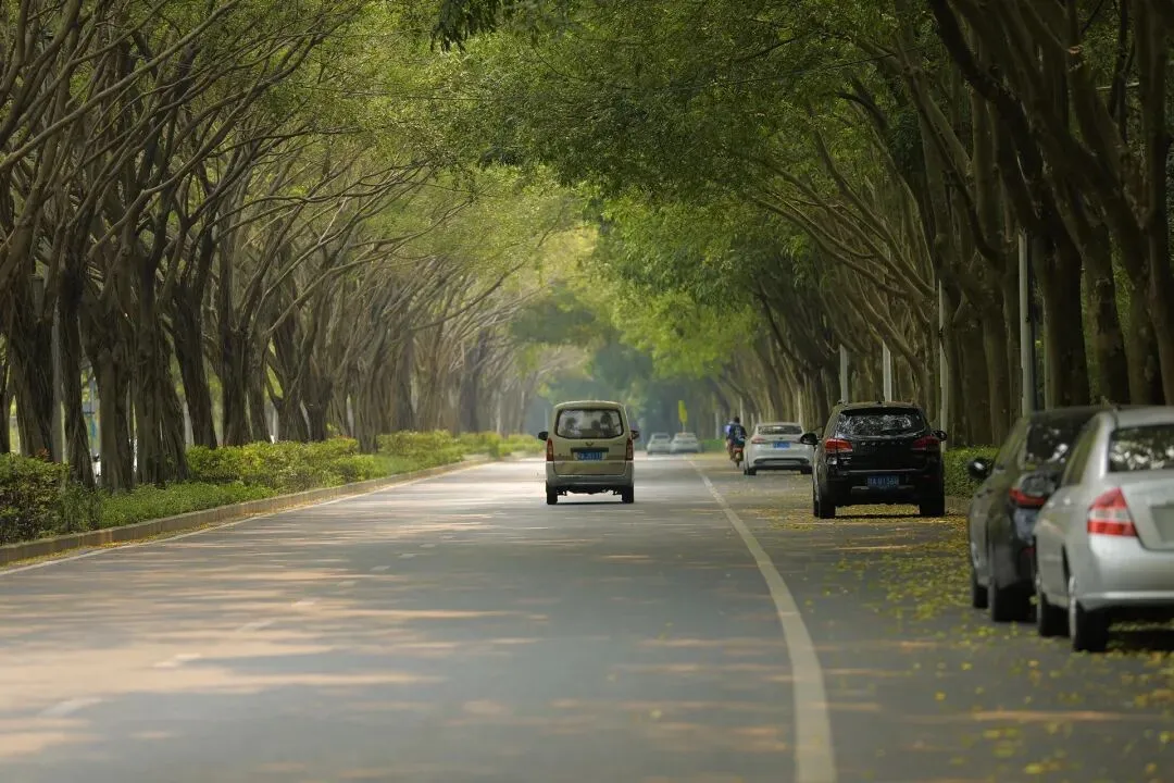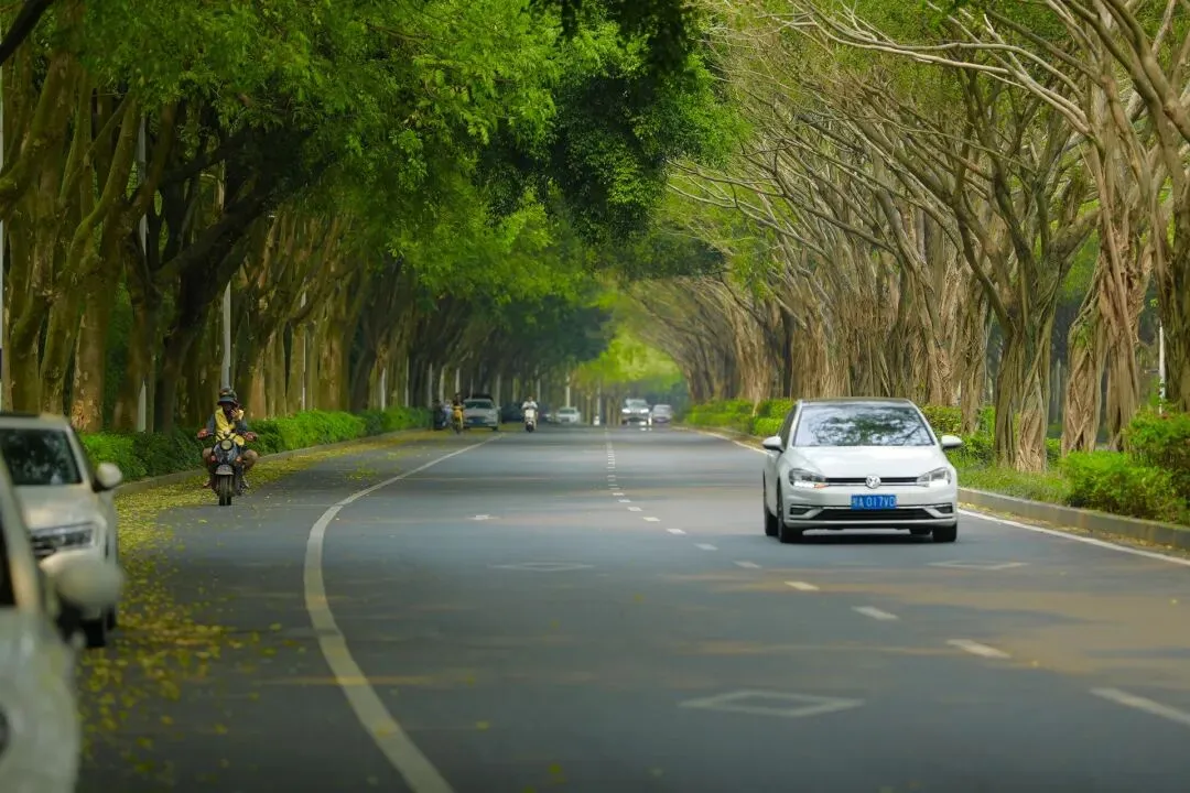 车开进这里,就像撞进了被绿意包裹的隧道——头顶是深浅错落的碧色,阳光从叶缝钻下来,在干净的沥青路面撒下满路碎金。连风都带着树叶的清润气息,把初夏的燥热吹得烟消云散。