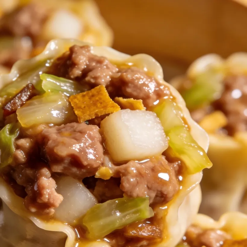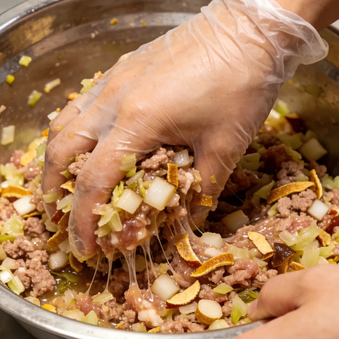 馅料是这只烧卖的灵魂:选新鲜牛里脊剁成糜(牛里脊没筋膜,口感最嫩),加荸荠粉增加爽滑感,再拌上果皮末(陈皮晒干磨的,去牛肉腥味还提香)、大头菜碎(增加脆嫩口感,解腻)。搅挞的时候顺着一个方向,直到肉馅起胶,这样蒸出来的肉馅才紧实,不会散。
