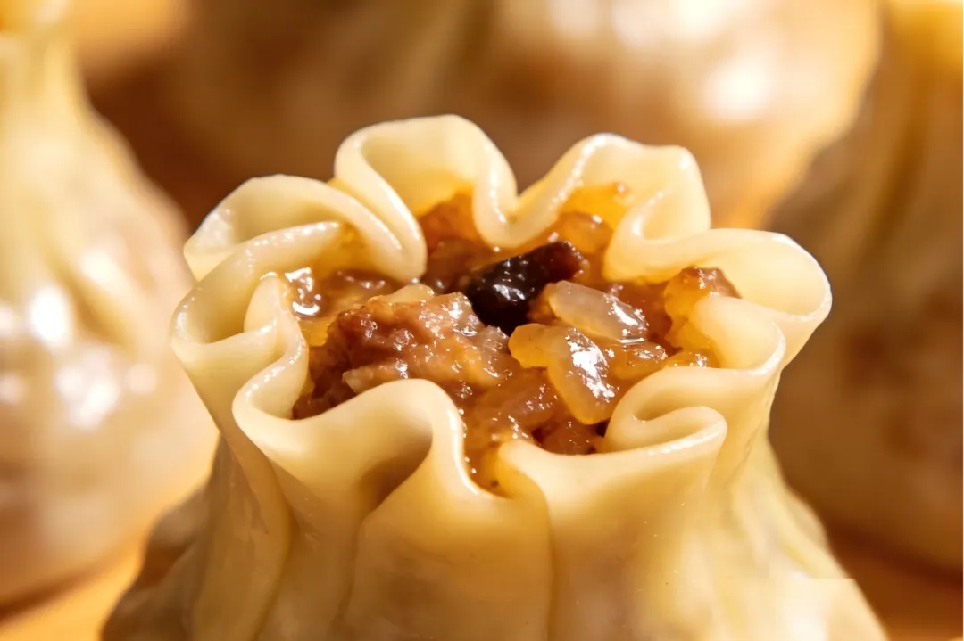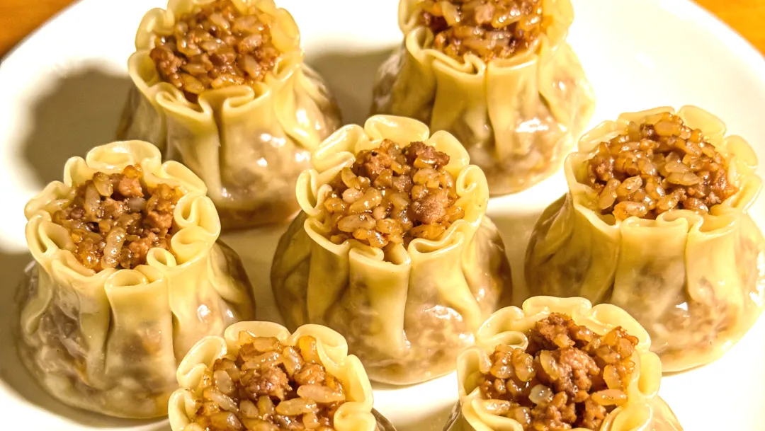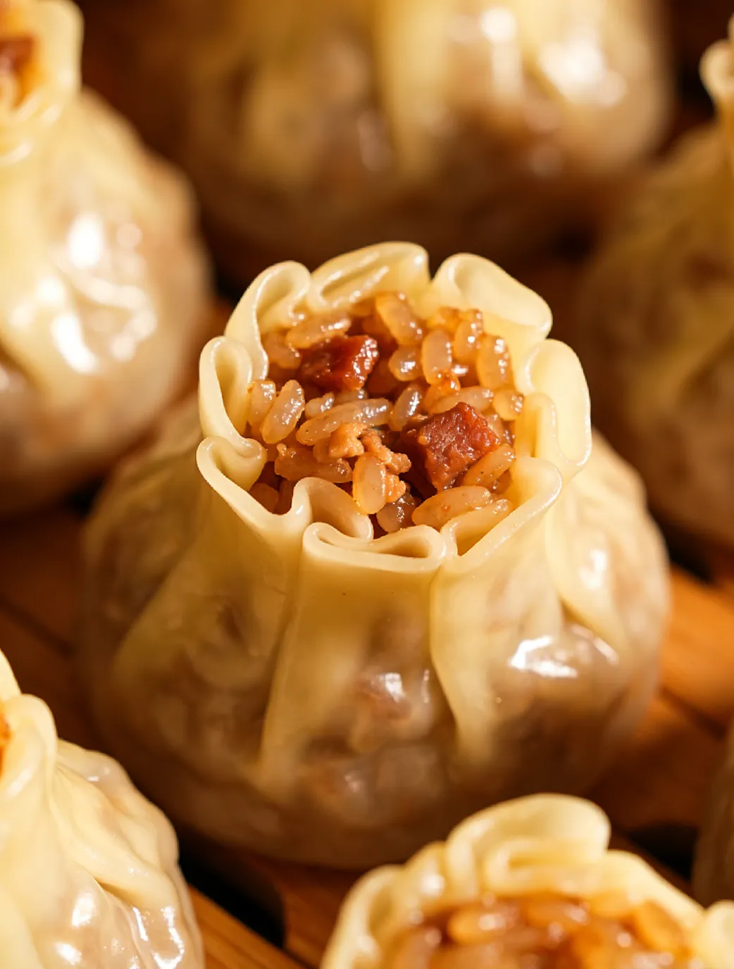 烧卖的皮是师傅手工擀的,薄却有韧性,包的时候会把顶部捏成精致的花芯形,留个小口能看到里面的肉馅,蒸好后晶莹剔透,像朵小花,比普通包子更显精致。