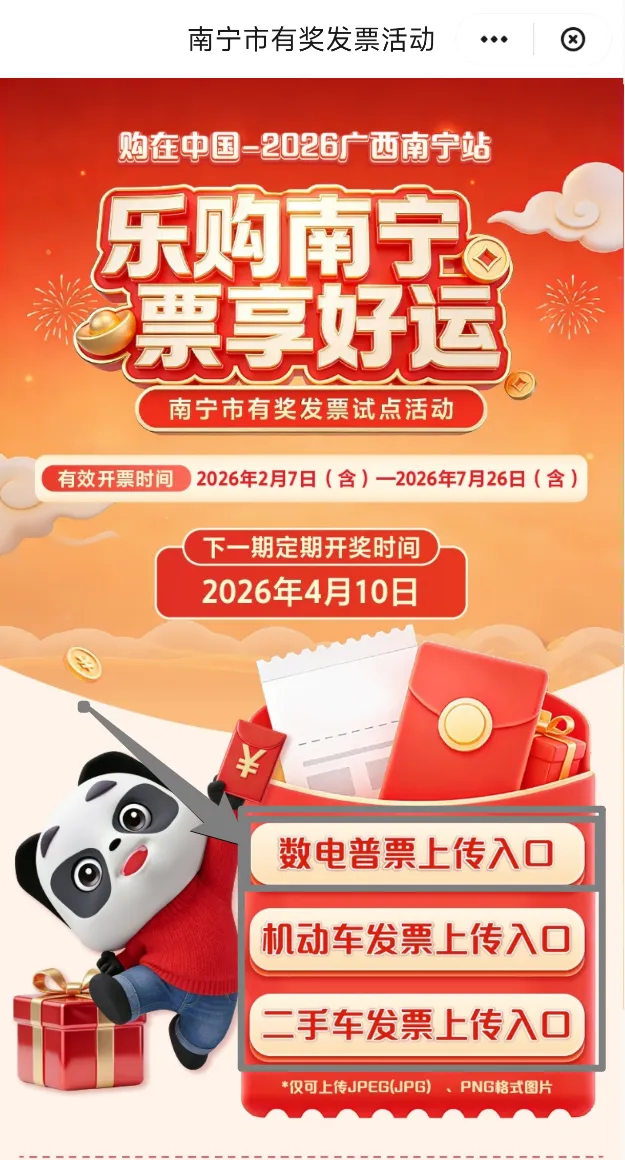 2026年2月7日(含)一2026年7月26日(含)期间,个人消费者以本人名义向南宁市范围内零售、餐饮、住宿、文化艺术、娱乐、旅游、体育、居民服务业等8类行业的经营主体(企业、个体工商户)购买商品和服务,并取得合法有效、符合活动条件且票面金额在100元(含)以上的全面数字化的电子发票(普通发票、机动车销售统一发票、二手车销售统一发票),按活动要求将发票照片或截图在本页面“发票上传入口”进行上传,即有资格参与抽奖消费者自2026年4月3日00:00起,可按规则上传发票参与“即时+定期”抽奖。每一期定期抽奖开奖时间在本活动页面公布。
