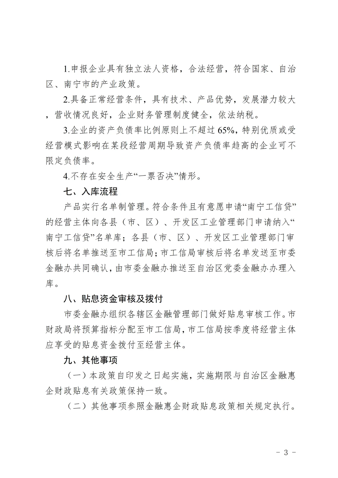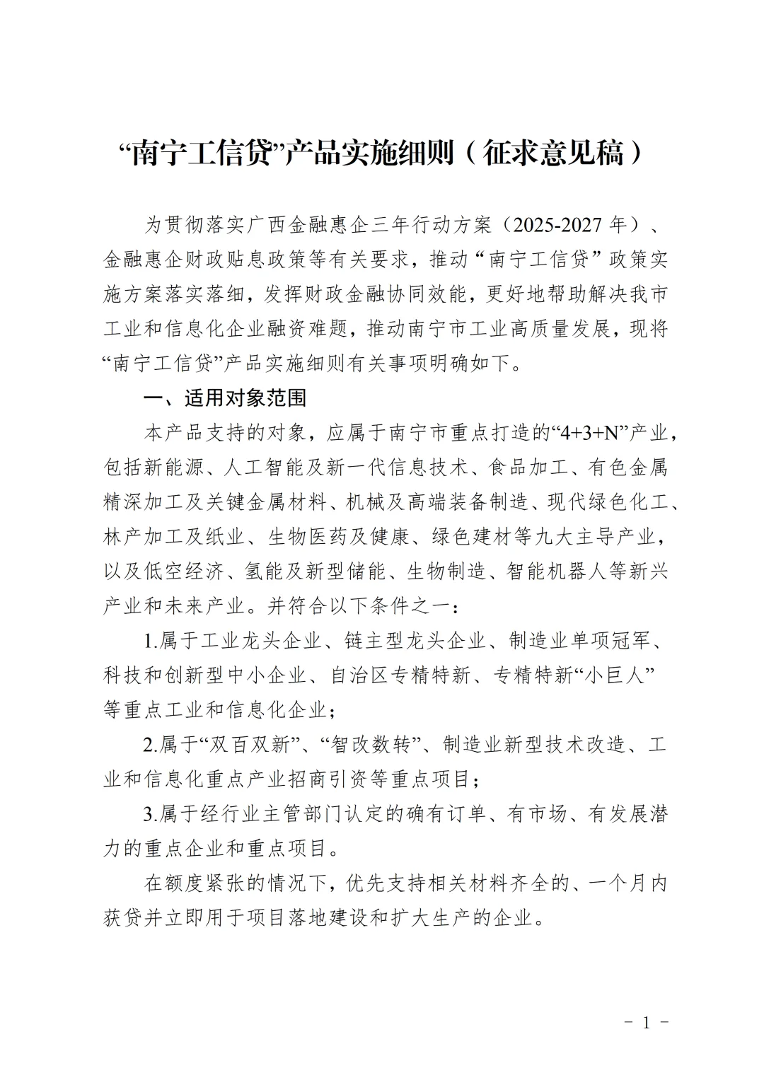 为贯彻落实广西金融惠企三年行动方案(2025-2027年)、金融惠企财政贴息政策等,深化财政金融联动,帮助解决工业和信息化领域企业融资难题,推动南宁市工业高质量发展,市工信局起草了《“南宁工信贷”产品实施细则(征求意见稿)》。现公开征询意见,有关单位和个人对文件内容、是否影响公平竞争等方面有意见建议的,请于2026年5月8日前通过电子邮件或登录南宁市行政立法和决策公开征求意见平台(http://gkzqyjpt.sf.nanning.gov.cn),向南宁市工信局提出意见并附理由。