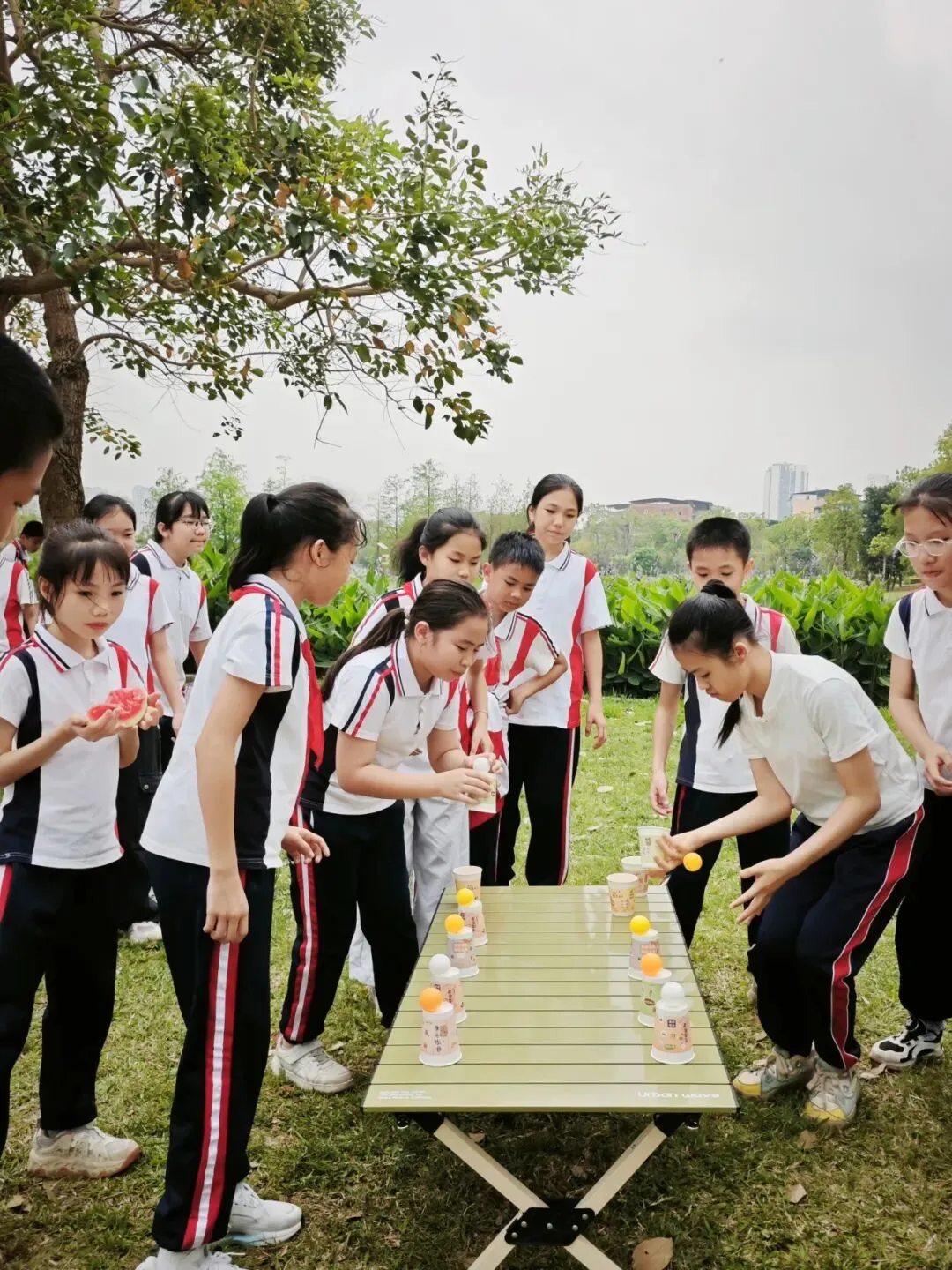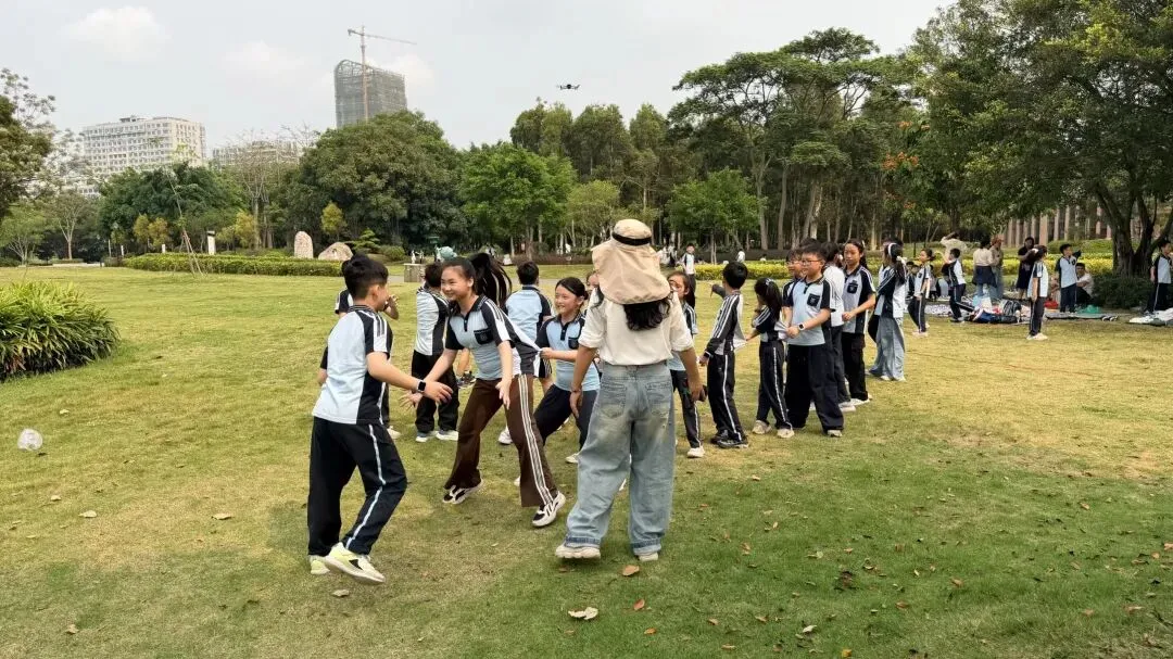 研学中同学们还玩起了欢乐的“贪吃蛇”游戏。大家排成一列长队,跟随“蛇头”的路线灵活穿梭、蜿蜒前行,时而加速、时而转弯,队伍像一条活泼的“长蛇”在草坪上舞动。