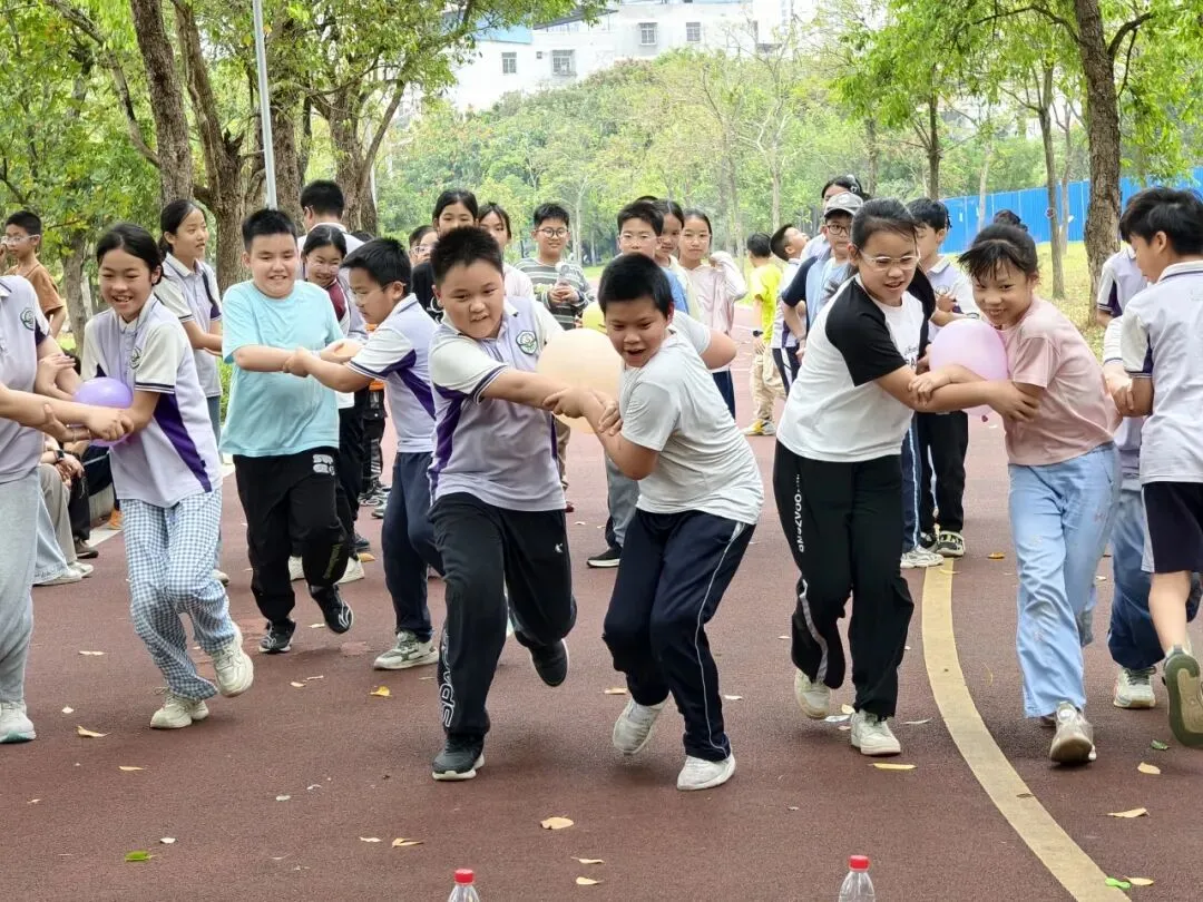 四(1)班的同学在进行“快乐抖抖球”活动,同学们腰间绑上彩色小球盒,随着音乐尽情摇摆、跳跃,奋力将盒中小球抖出。大家动作滑稽可爱,围观的同学笑得前仰后翻。