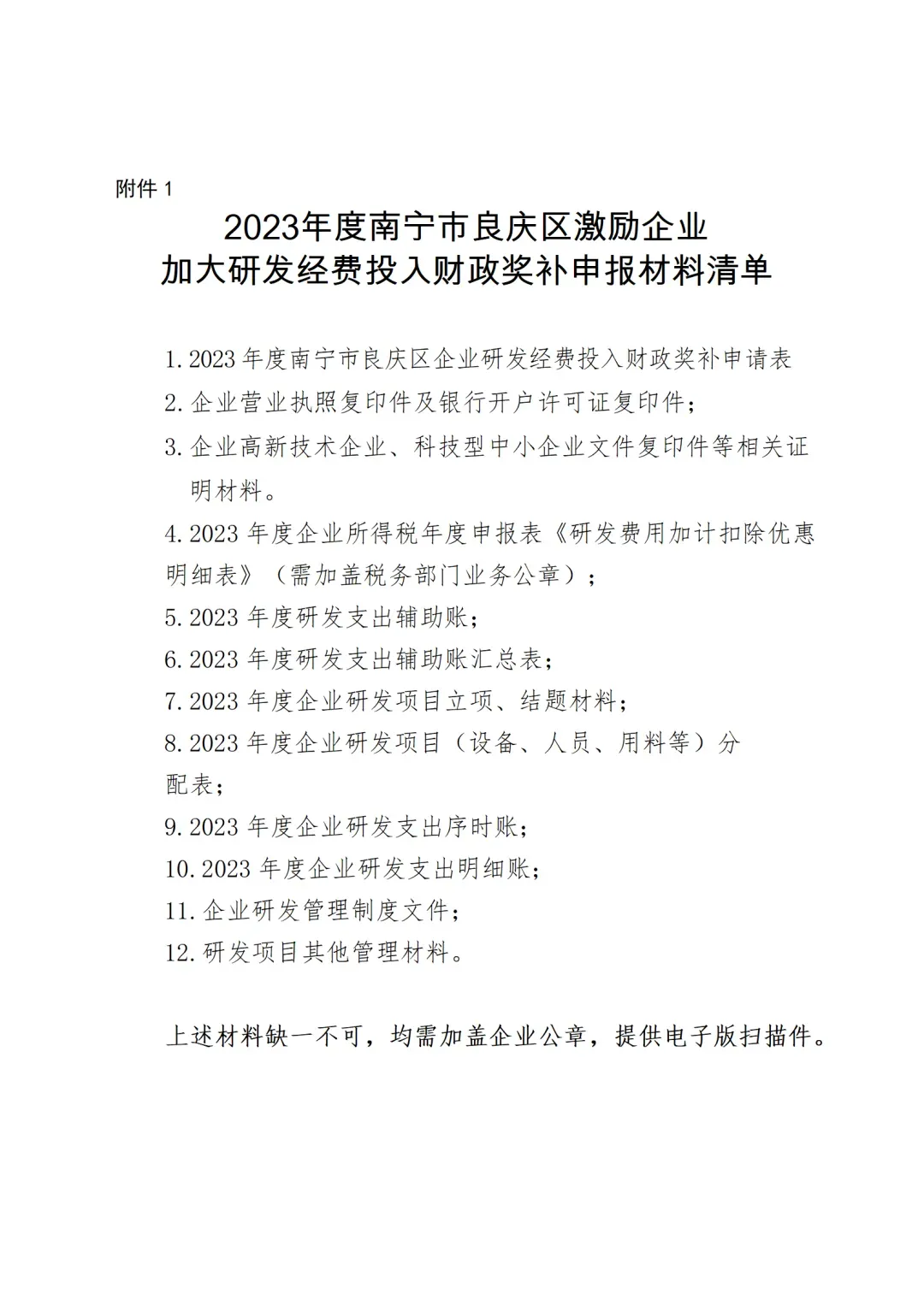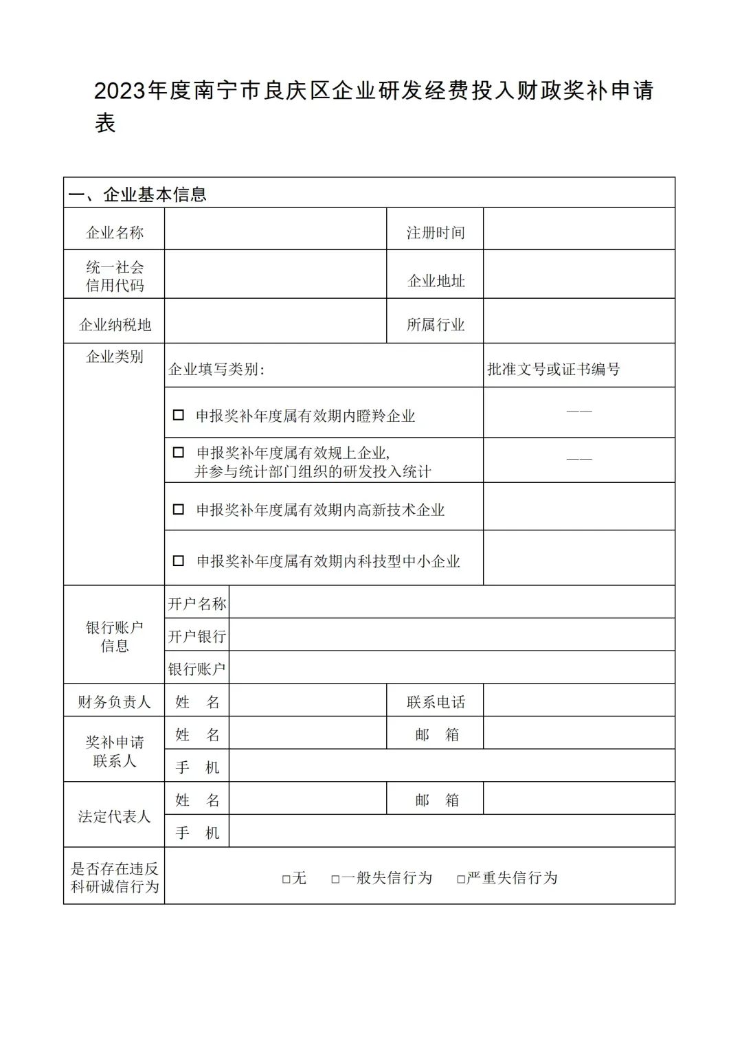申请财政奖补的企业须同时满足以下条件:(一)至今仍在南宁市良庆区行政区域内登记注册,具有独立法人资格,诚信经营,且依法在良庆区申报纳税(截至申报时仍在正常经营)。(二)截至2023年12月31日,仍处于认定有效期内,属于以下类型之一:1.瞪羚企业、高新技术企业、科技型中小企业等科技创新型企业;2.规模以上企业。(三)已就2023年度研发费用申报并享受企业所得税税前加计扣除税收优惠政策;规模以上企业还需按要求完成统计部门研发经费投入报统工作,提供已纳统的统计数据佐证。(四)具有健全的财务管理制度,能够按照《企业会计准则》或《企业会计准则》等规定,设置研发支出科目,并进行规范会计核算。(五)未发生科研严重失信行为,未被列入经营异常名录、严重违法失信企业名单,无涉税、涉统等违法违规行为,无财政资金使用违纪、违规、违法行为。