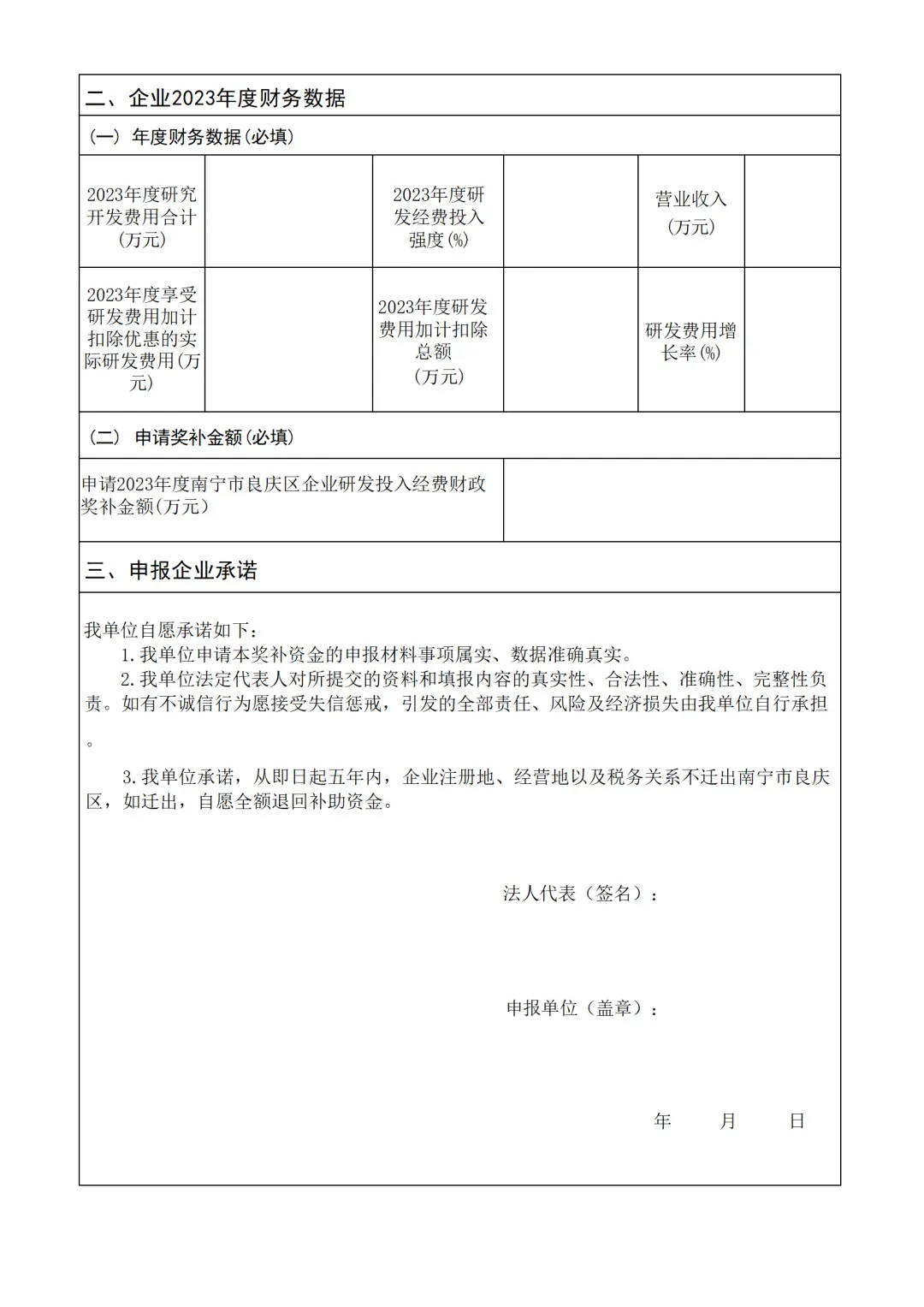 2.电脑 端登录下方网址填报: ttps://docs.qq.com/form/page/DT3BNQXZhRWd0aWtu#/fil1.(二)报送申报材料。企业按照本通知要求将申报材料PDF盖章扫描件(按清单顺序将申报材料合并为同一PDF文件)和 WORD版文档打包压缩作为邮件附件报送至电子邮箱: lqqkjjyw@163.com,压缩文件名称和邮件名称统一规范为“企业名称+2023年度研发奖补申报”。申报单位须对报送的电子版材料真实性和准确性负责。(三)审核与公示:1.良庆区科技局组织专家对申报良庆区2023年度企业研发经费投入奖补的材料进行审核评估,并根据需要现场核查;2.良庆区科技局联合良庆区财政局、发改局、经信局、统计局、税务局等部门,对申报材料、研发活动情况及奖补金额进行联合审核;3.审核通过的拟奖补企业名单及金额,将在良庆区科技局官方网站公示5个工作日。公示期满无异议后,由良庆区科技局按程序报请良庆区人民政府审批,审批同意后下达奖补资金拨付文件,按规定组织资金兑付。