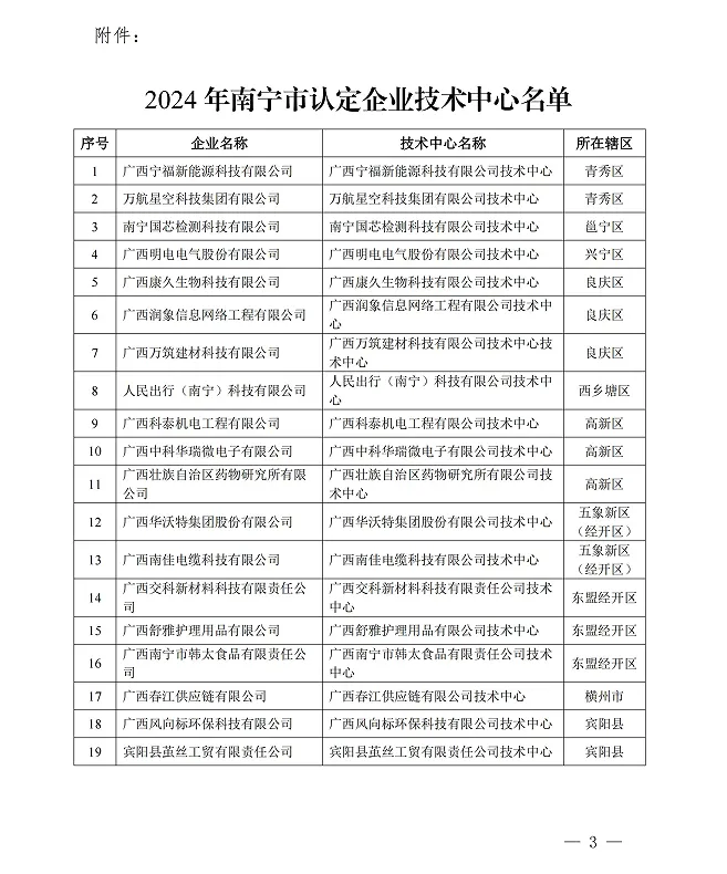 为贯彻国家、自治区、南宁市实施创新驱动发展战略,全面落实市委、市政府关于推进工业振兴工作部署,根据《南宁市认定企业技术中心管理办法》相关规定,经组织专家评审及公示,确定广西宁福新能源科技有限公司等19家企业技术中心为2024年南宁市认定企业技术中心,现将名单予以公布(具体详见附件)。