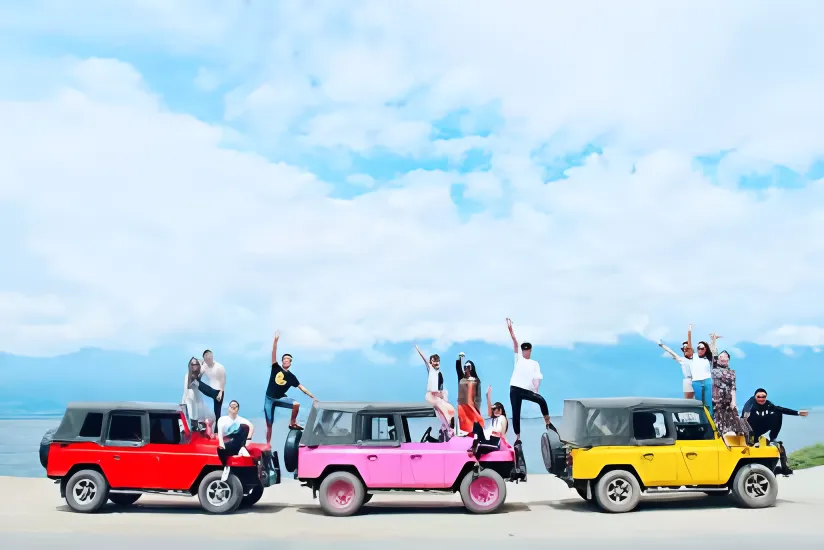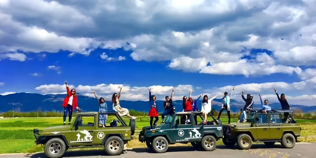 中餐后乘车前往指定地点游览【吉普车+大理花海】(四人一车)(游览时间90分钟左右)去体验不一样的洱海,也许大理给你的是安静,是世外,是文艺!但其实这只是大理的一部分,除去诗和远方的文艺,那就是—酷,老司机带你嗨,拉风的座驾,嗨在洱海边,自由、放纵,回归旅行最初的本质。笑意写在脸上,哼一曲乡居小唱,任思绪在晚风中飞扬,多少落寞惆怅,都随晚风飘散,遗忘在乡间的小路上。。风花雪月的大理,花开四季,无论是春秋,还是严冬,都拷贝了那春季的花开,步行于宁静的田园,片片粉红的花瓣,绽放在相望路边。