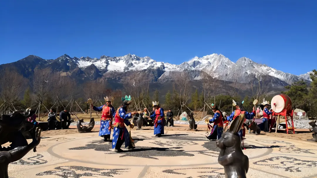 早餐后,参观云南特色民俗贸易文化区(参观时长约2.5小时),前往参观白族民俗文化博物馆 马帮文化的展示 了解白族民居青瓦白墙 三滴水门头 风水照壁,参观了解大理雪花银,现场加工体验。中餐后乘车前往丽江,随后游览【雪山峡谷演艺公园(东巴秘境)】(必消含大门票、不含电瓶车60元/人,需自理)它位于白沙古镇,距离大研古城约19公里,距离三义机场约46公里。比起其他地方,个人认为东巴秘境欣赏玉龙雪山的角度最好。在丽江,我们随处可见长廊木架上挂满密密麻麻的风铃,它们有一个统一的名称,叫做“东巴许愿风铃”,东巴文化是纳西族的传统文化,而东巴教是相信万物有灵的多神教,他们相信铃声会给人们带来吉祥与平安。