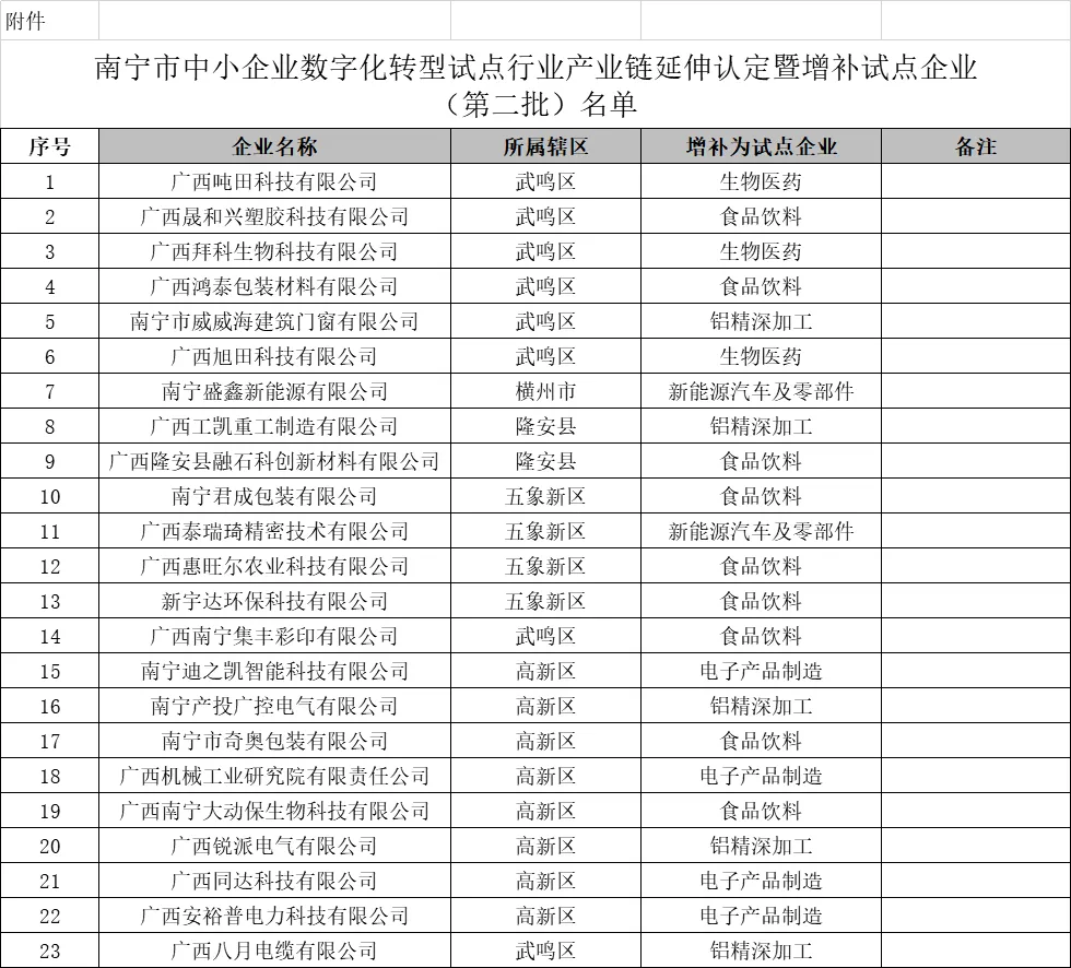 附件:南宁市中小企业数字化转型试点行业产业链延伸认定暨增补试点企业(第二批)名单