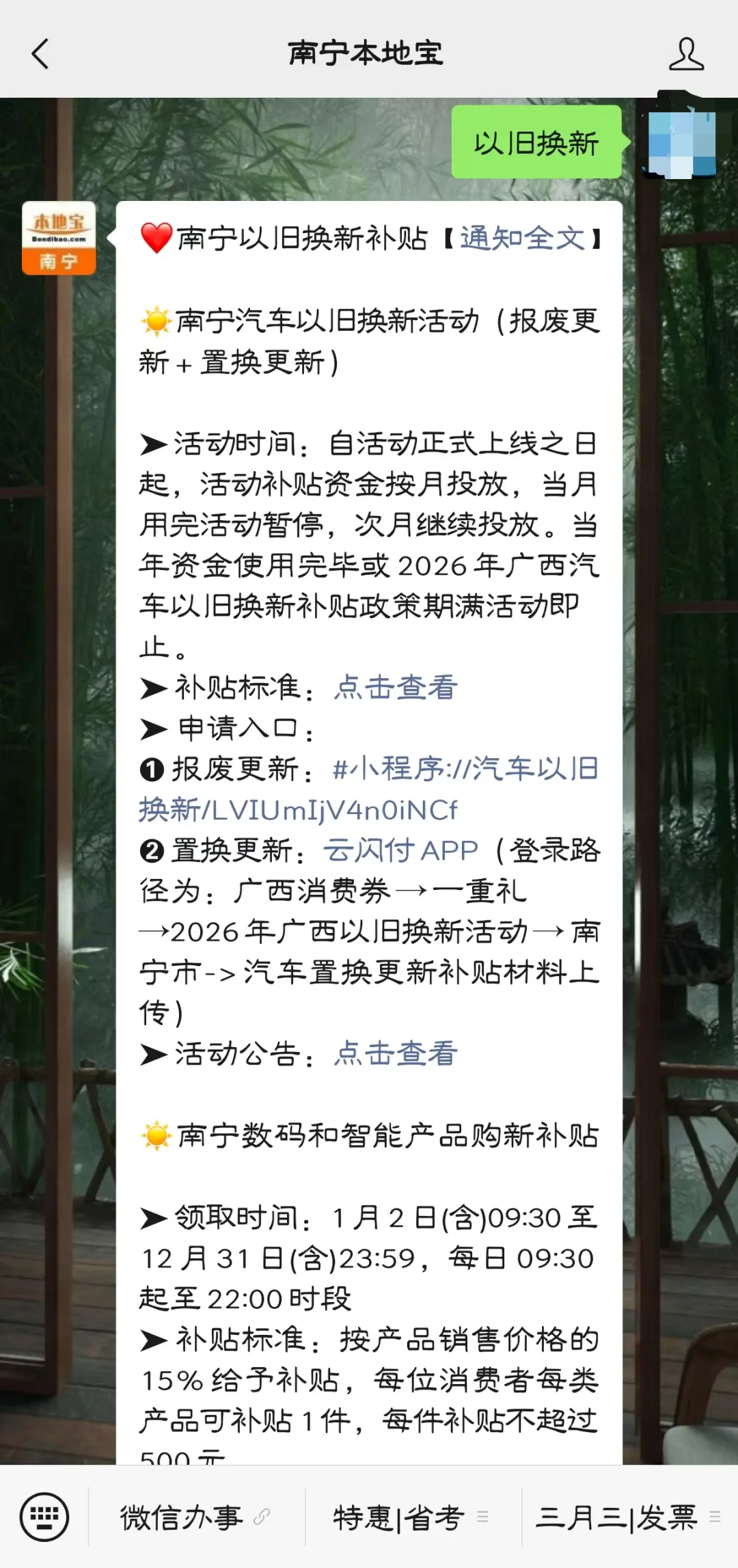 关注【南宁本地宝】微信公众号,在对话框回复【以旧换新】,获南宁家电以旧换新/数码和智能产品购新补贴申请入口、政策通知全文、活动规则等。