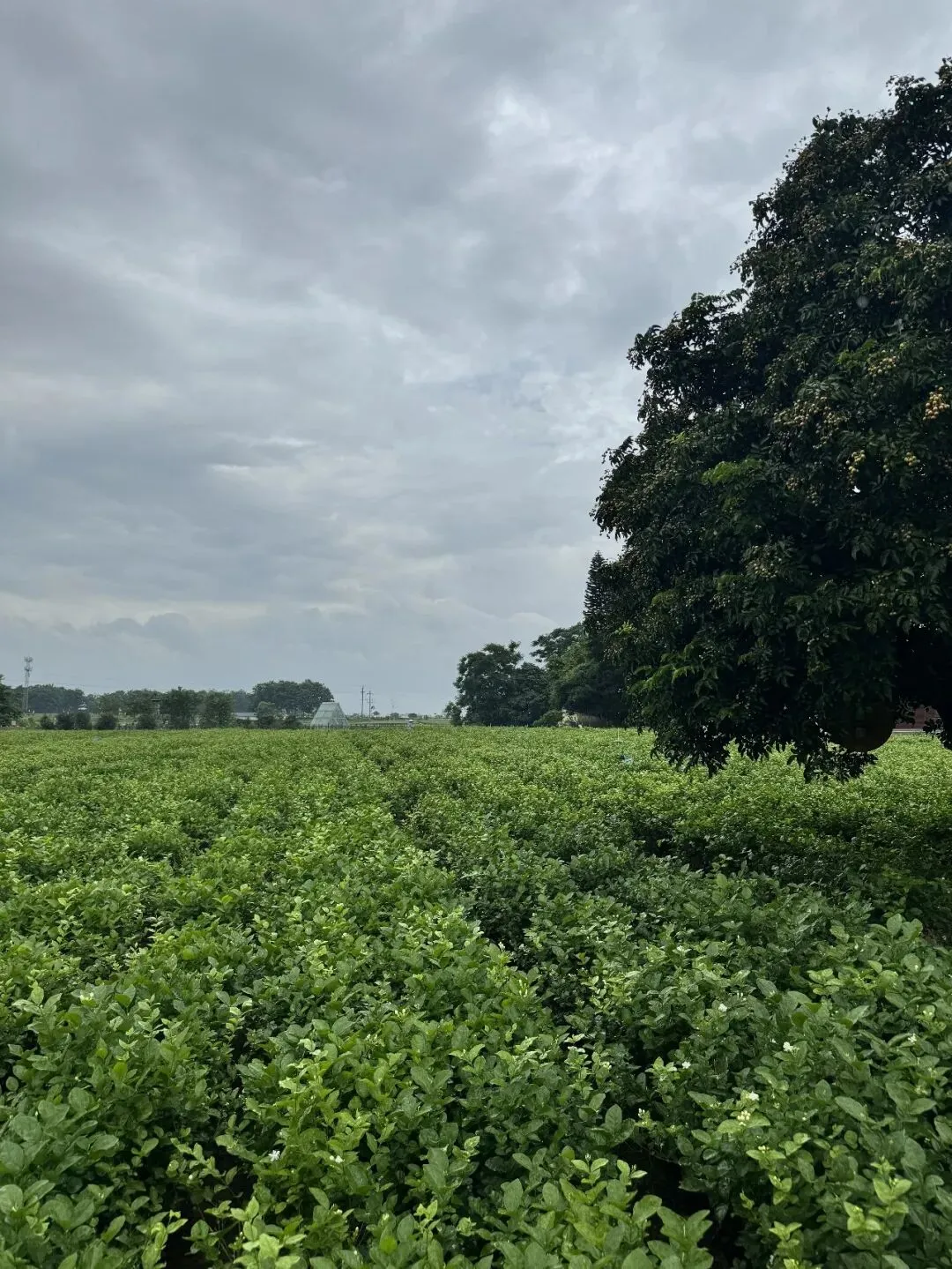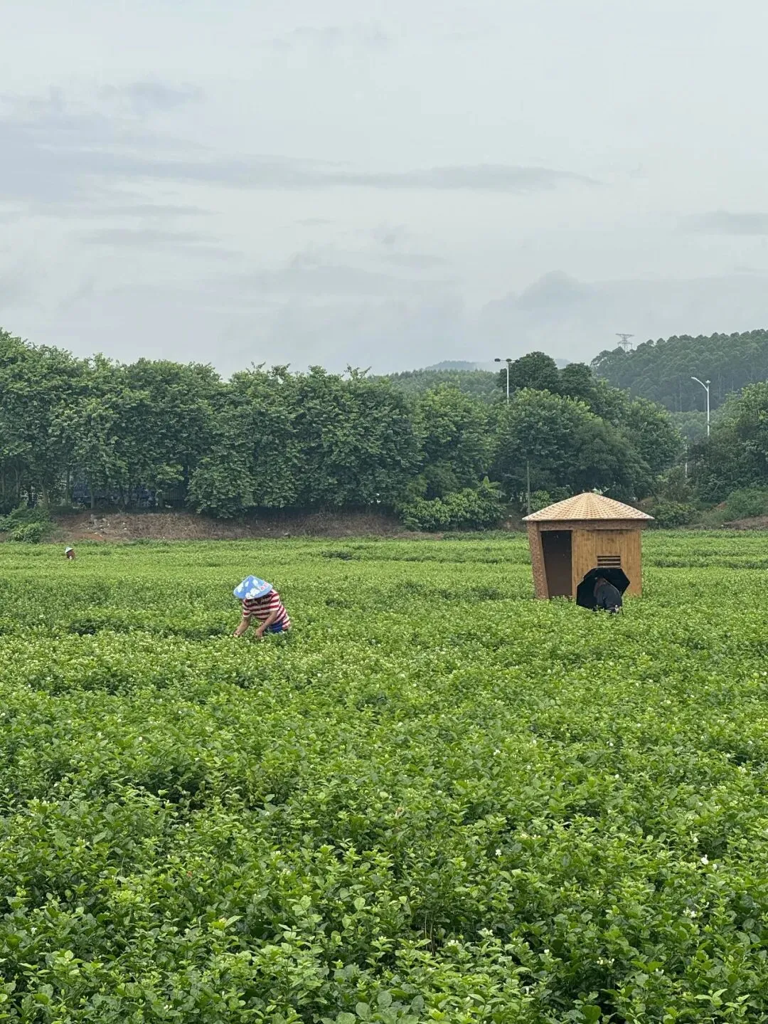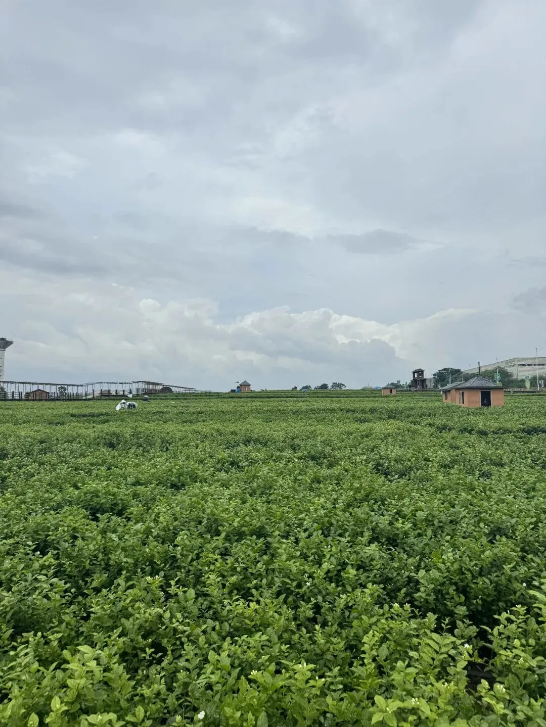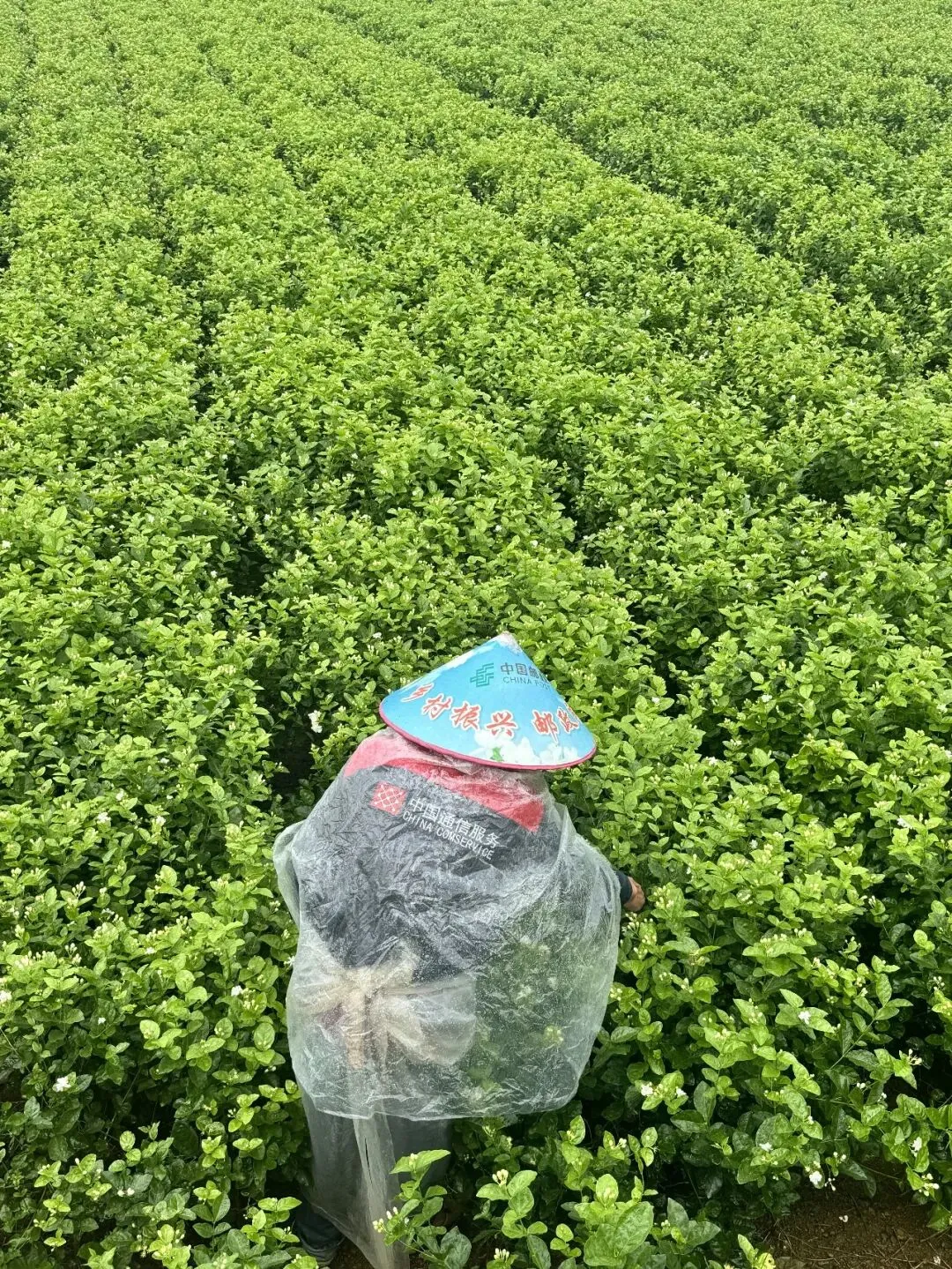 恰逢阴天,偶尔有点小雨,但花田里仍有农户在采摘茉莉花,一阵香味扑鼻。