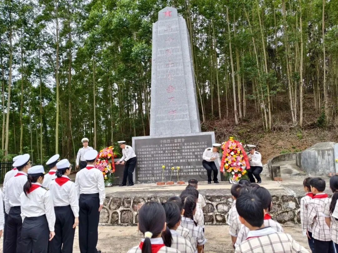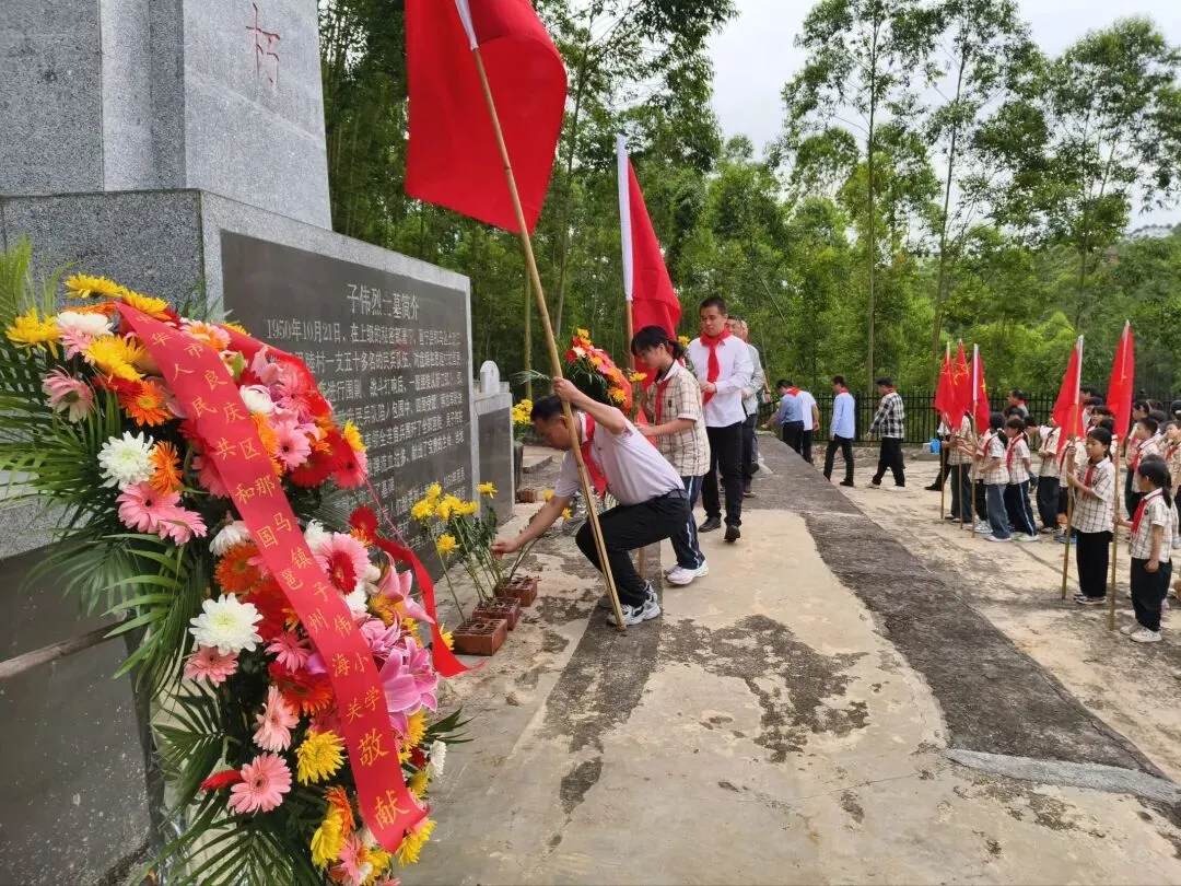 那马镇子伟小学联合邕州海关、良庆区教育局、那马镇政府、那马镇中心学校,组织师生代表走进子伟村烈士墓。在烈士墓碑前,全体人员肃立默哀,邕州海关代表敬献花圈。那马镇子伟村委支书高磊讲述英烈事迹后,那马镇子伟小学主任李岸霏主任带领师生代表庄严宣誓。最后,大家依次敬献亲手制作的手花,以最赤诚的心意缅怀先怀先烈、传承英雄精神。