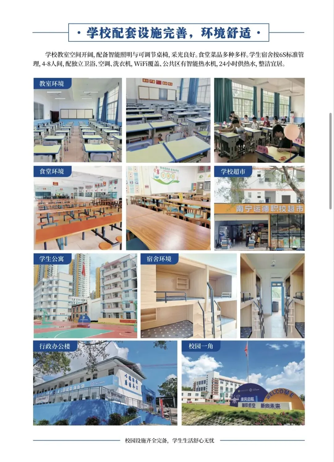 ✅ 校园环境:教室配备智能照明与可调节桌椅,采光良好;食堂菜品丰富;学生宿舍6S标准管理,4-8人间配独立卫浴、空调、洗衣机、WiFi,24小时热水供应;